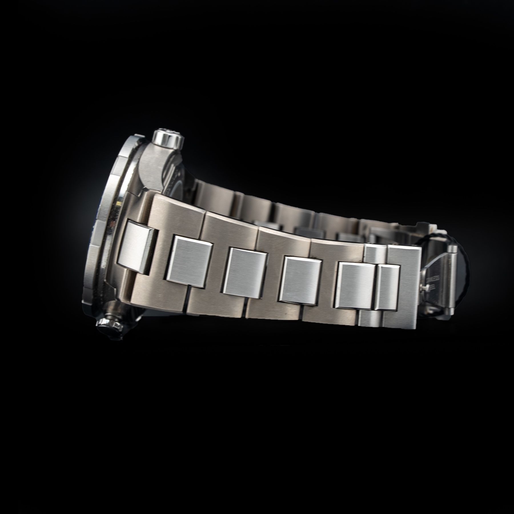 This watch features a 40mm stainless steel case on stainless steel bracelet. This watch also sports a black dial. Powered by an automatic movement. Water resistance up to 200 meters.