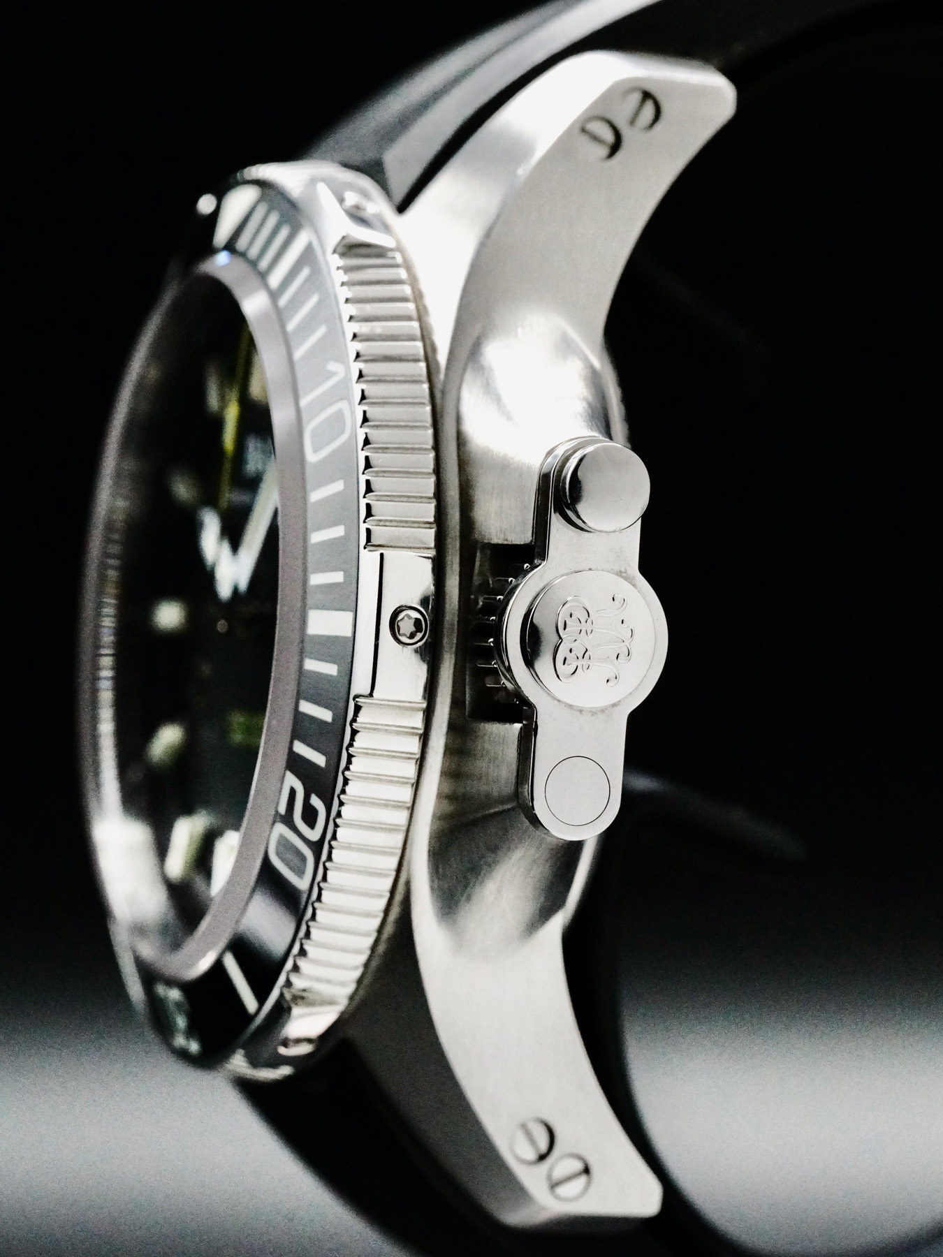 This watch features a 42 mm titanium case with stainless steel bezel on rubber strap. This watch also sports a black dial. Powered by an automatic movement . Water resistance up to 300 meters.