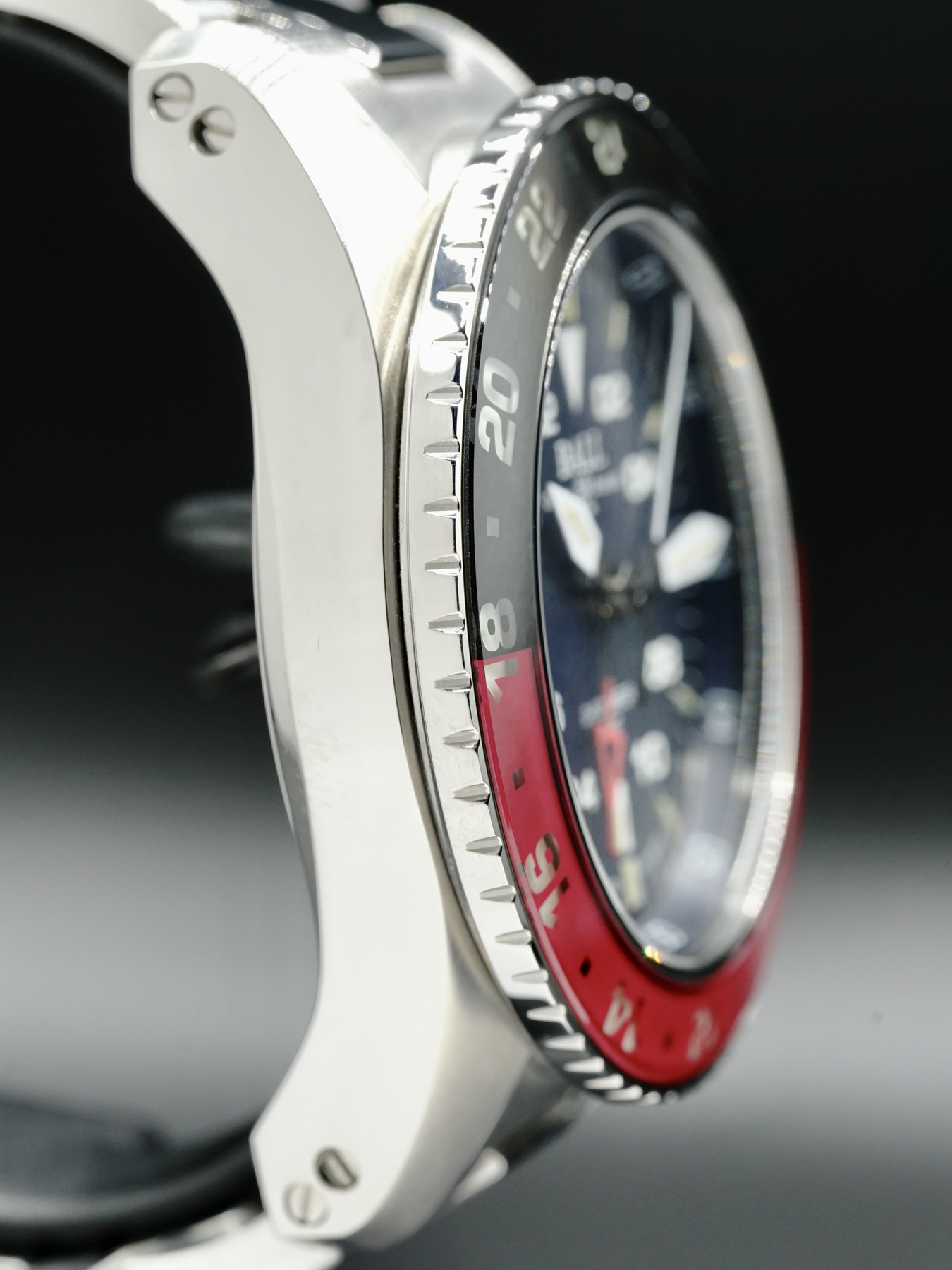 This Ball Engineer Hydrocarbon AeroGMT II features a 42mm stainless steel case and red/black, two-toned sapphire bezel with a solid case back on a stainless steel bracelet. This watch also showcases a blue dial with micro-gas tube hands & dial markers for night readability covered by anti-reflective sapphire crystal.