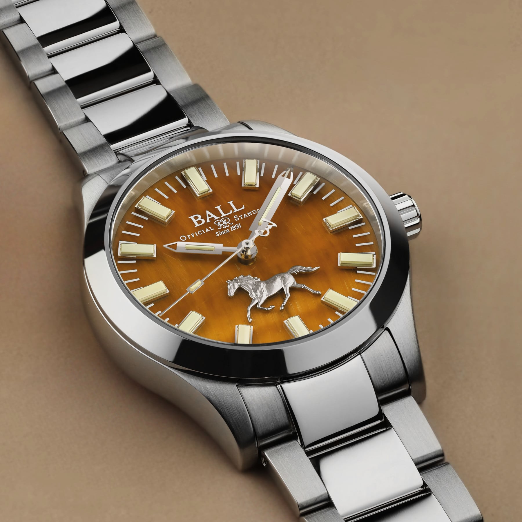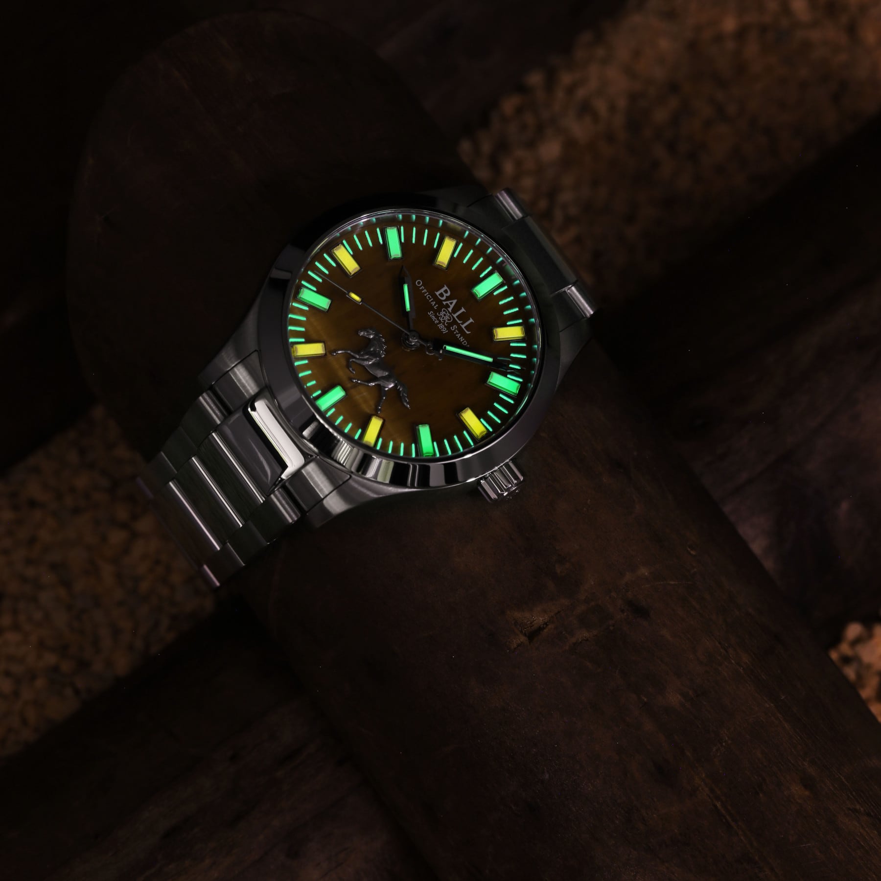 Drawing inspiration from the Five Elements philosophy in Chinese culture – where elements interact in cycles of creation and transformation – the Fire element nourishes the Earth. Thus, BALL crafted the dial from Tiger’s Eye, a gemstone associated with the Earth element. This design signifies the transformation of fire’s energy into fertile ground that gives rise to all life.