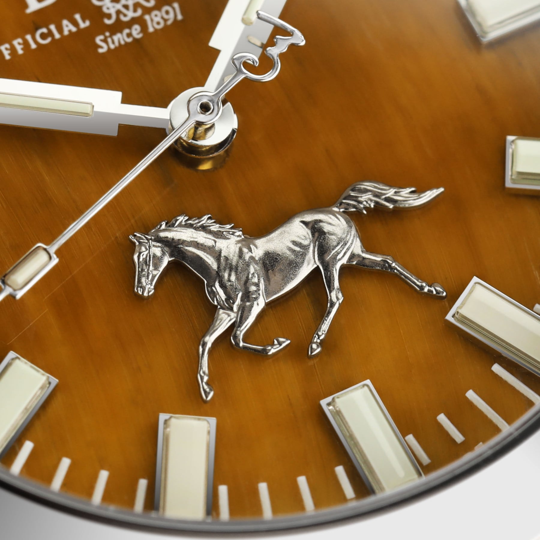 An emblem of resilience, strength, and courage, Tiger’s Eye is a golden-brown gemstone known for its chatoyancy. This reflective quality creates a cat’s-eye effect that makes the dial appear to shimmer depending on the angle of the light. Crafting a Tiger’s Eye dial is a meticulous process– designed to showcase the stone’s natural beauty while preserving its durability. Every dial features the fascinating interplay of golden-brown hues, subtle stripes and shimmering qualities. No two Tiger’s Eye dials will look exactly alike. Ever.