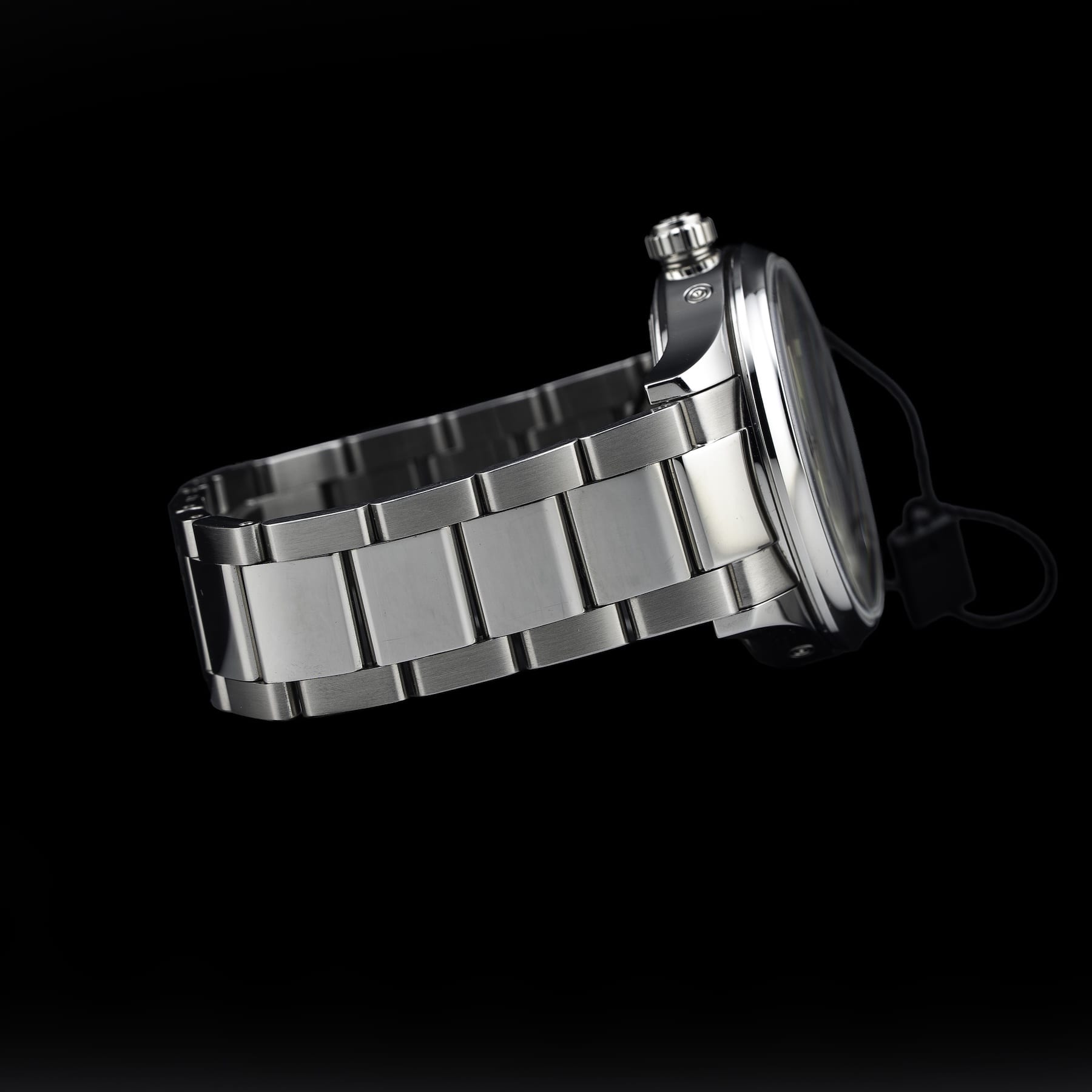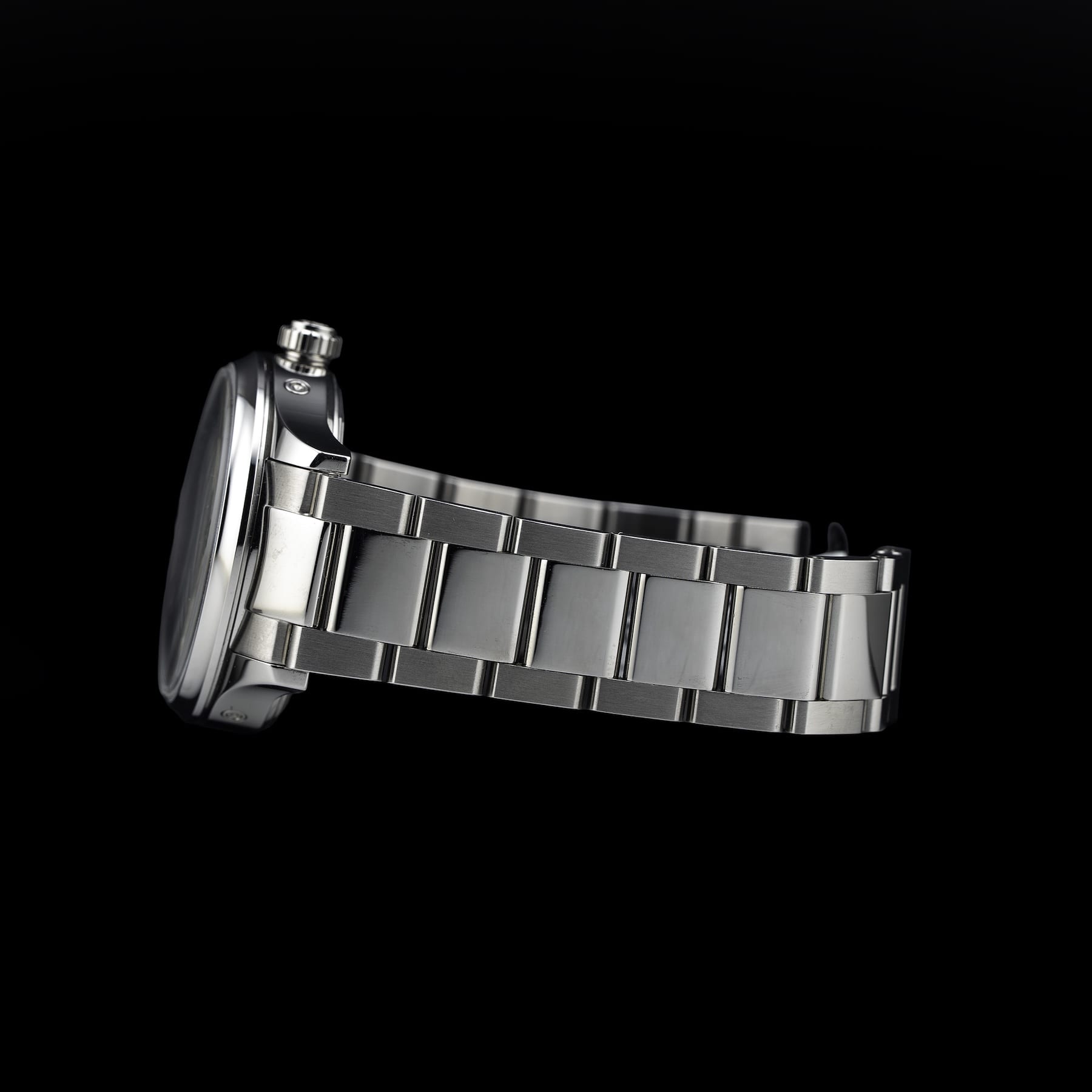 - This timepiece features a 40mm steel case paired with a high quality steel bracelet. It showcases a distinctive silver dial and is powered by a precise automatic winding movement. The watch is designed with a water resistance of up to 100m.