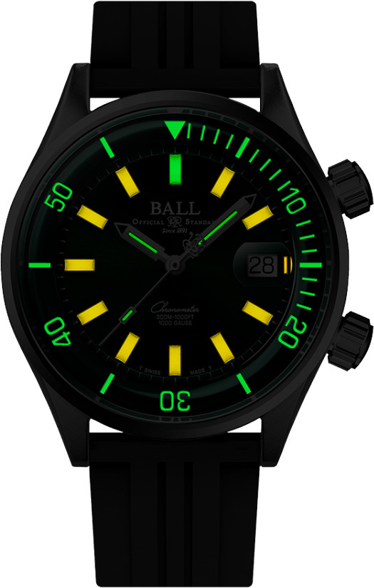 This watch features hands and dial markers that are illuminated with micro-gas tubes for easy reading in low light conditions. It has a number of functions, including hours, minutes, seconds, and date. It runs on a mechanical automatic movement, Caliber BALL RR1101-C, that has been certified by the COSC as a chronometer, ensuring precise timekeeping.
