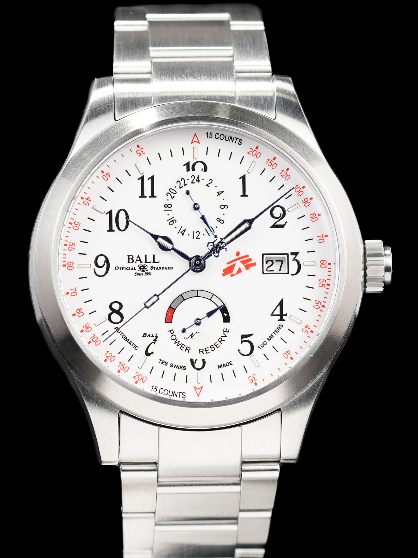 This watch features a 44mm stainless steel case on stainless steel bracelet. This watch also sports a white dial. Powered by an automatic movement. Water resistance up to 100 meters.