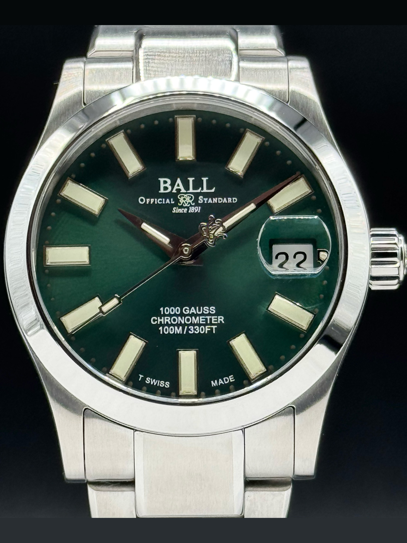 This watch features a 36mm stainless steel case on stainless steel bracelet. This watch also sports a green dial. Powered by an automatic caliber BALL RR1101-C movement. Water resistance up to 100 meters.