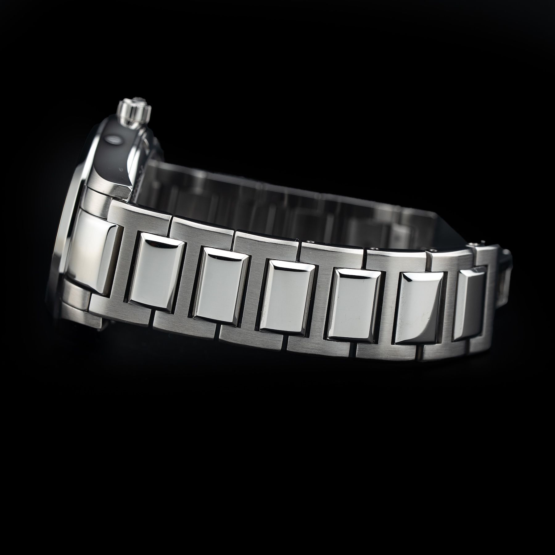 This watch features a 43mm stainless steel case on stainless steel bracelet. This watch also sports a blue dial. Powered by a mechanical automatic movement. Water resistance up to 100 meters.