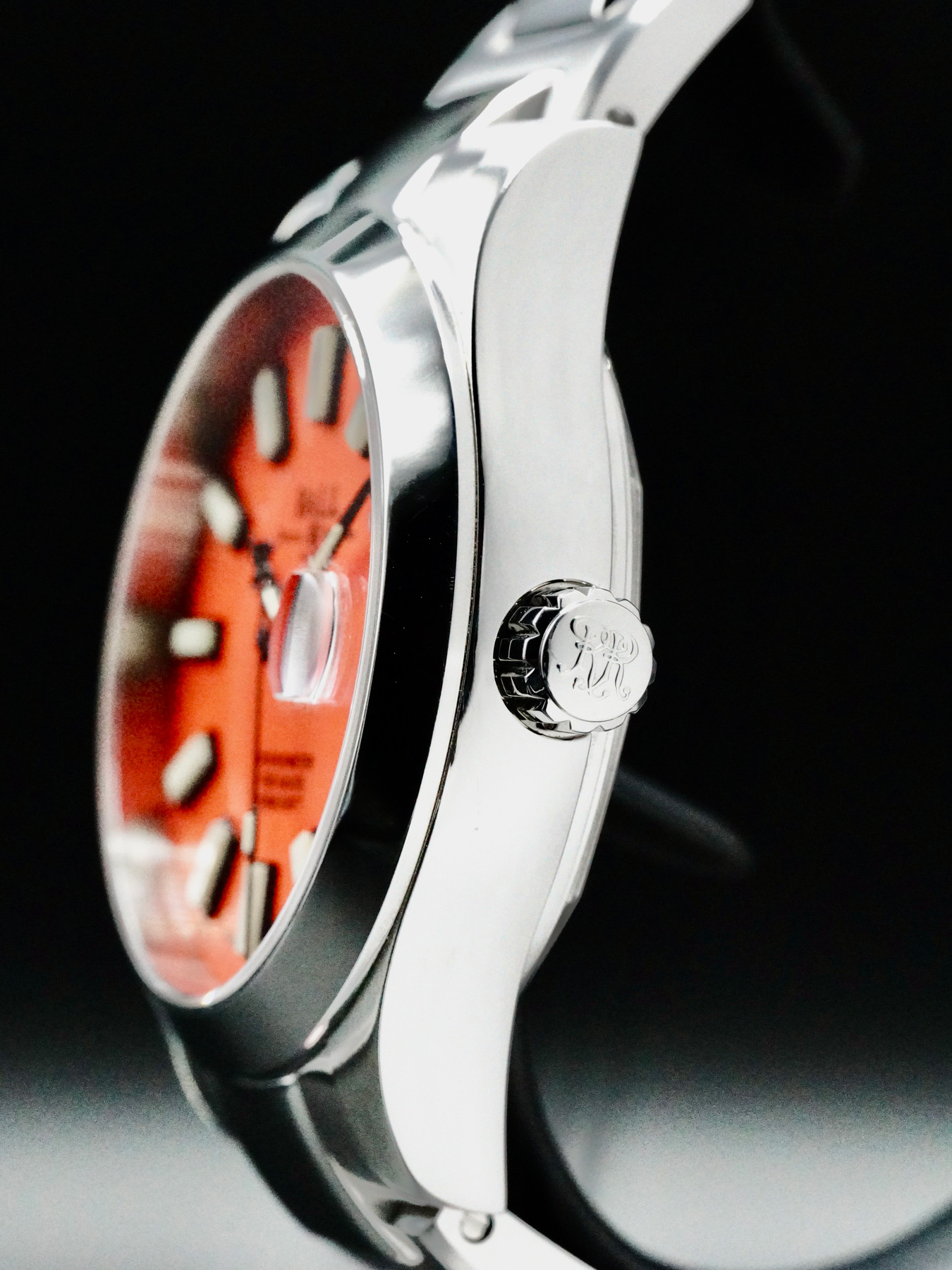 This watch features a 40 mm stainless steel case and bracelet. This watch also sports a orange dial. Powered by a mechanical automatic movement. Water resistance up to 100 meters.
