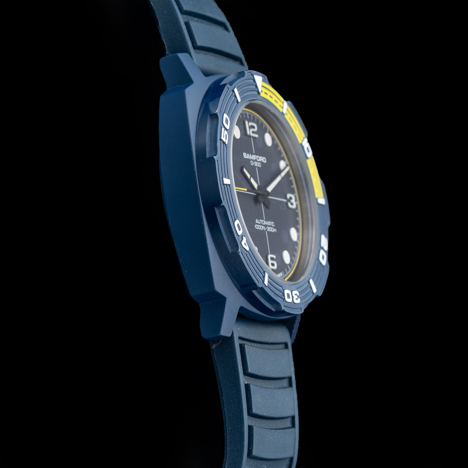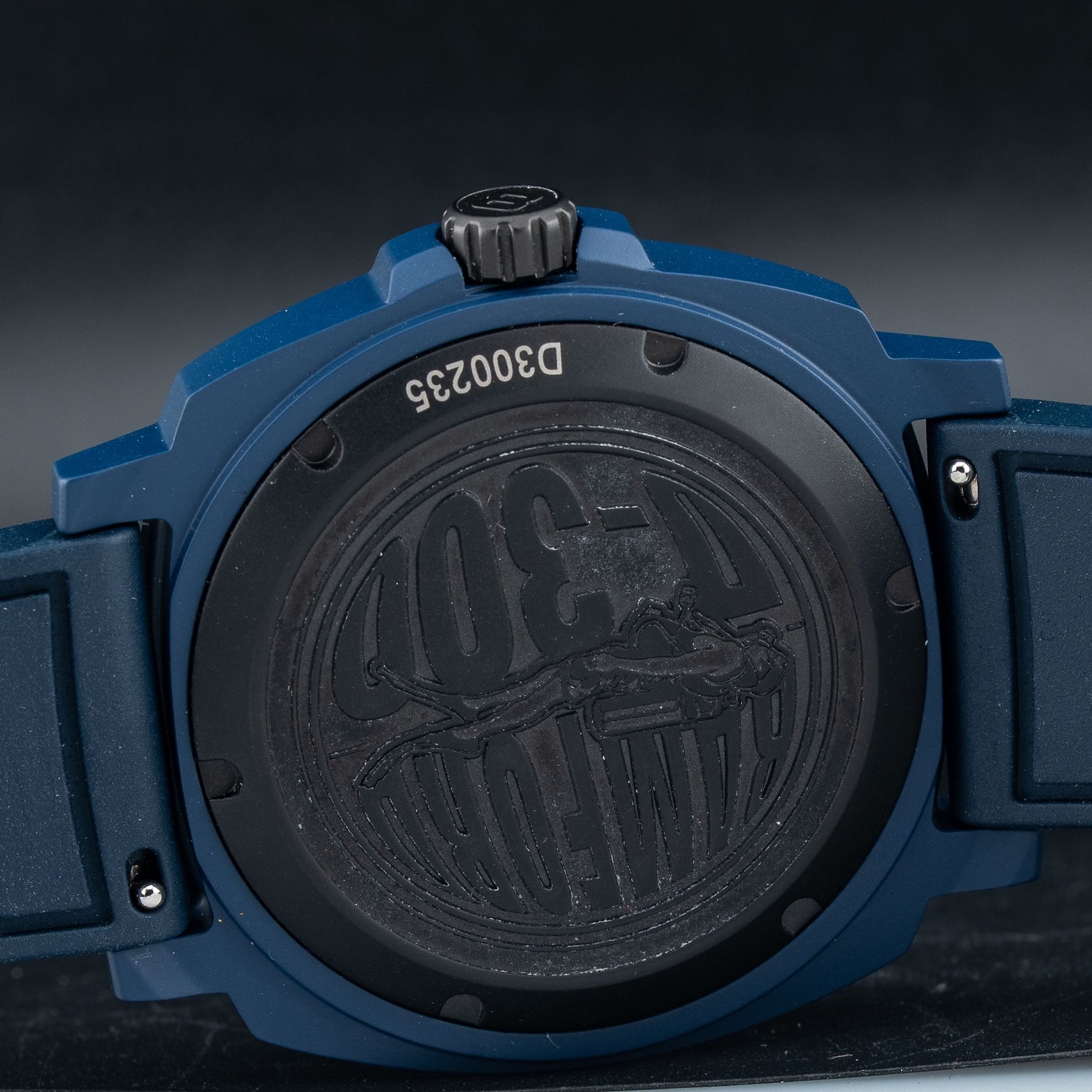 This watch features a 42mm ceramic case on rubber strap. This watch also sports a blue dial. Powered by an automatic movement. Water resistance up to 300 meters.
