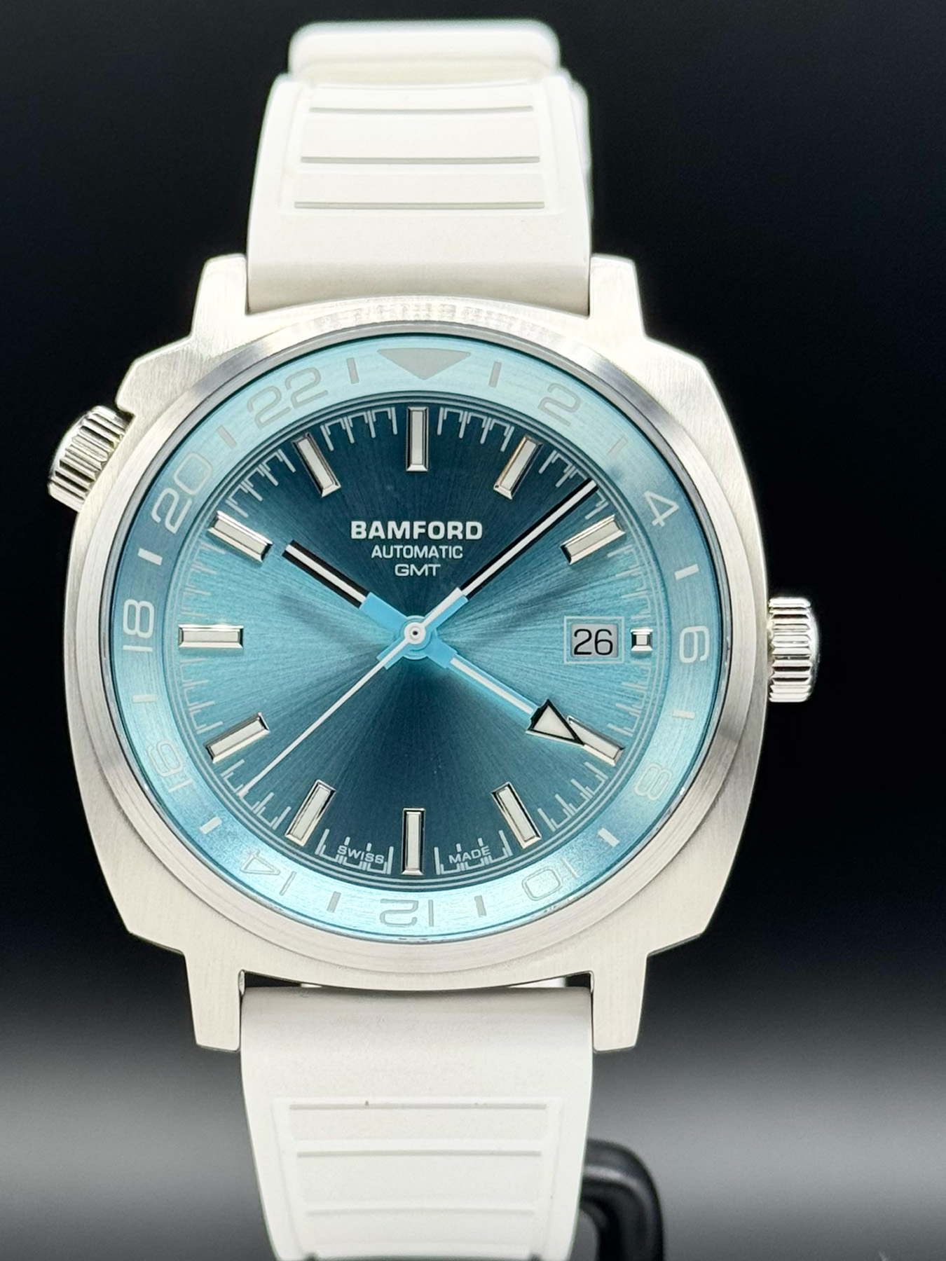 This Bamford London Glacier Sunburst GMT is in GOOD condition. This watch includes its Original Box, Warranty Card Dated November 2023. This watch has been fully authenticated and certified by Exquisite Timepieces.
