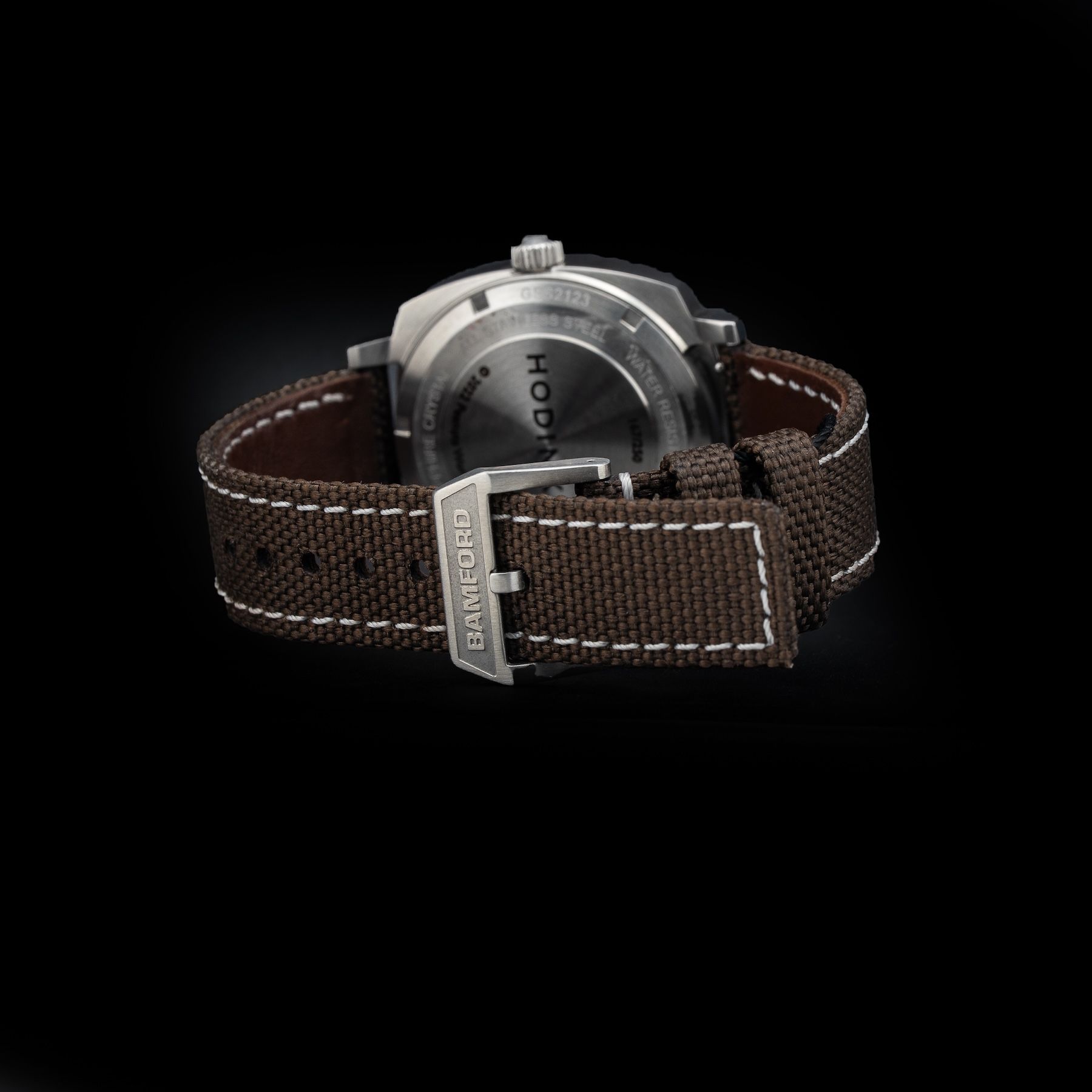 This watch features a 40mm stainless steel case on cordura strap. This watch also sports a black and white dial. Powered by a self-winding movement. Water resistance up to 100 meters.