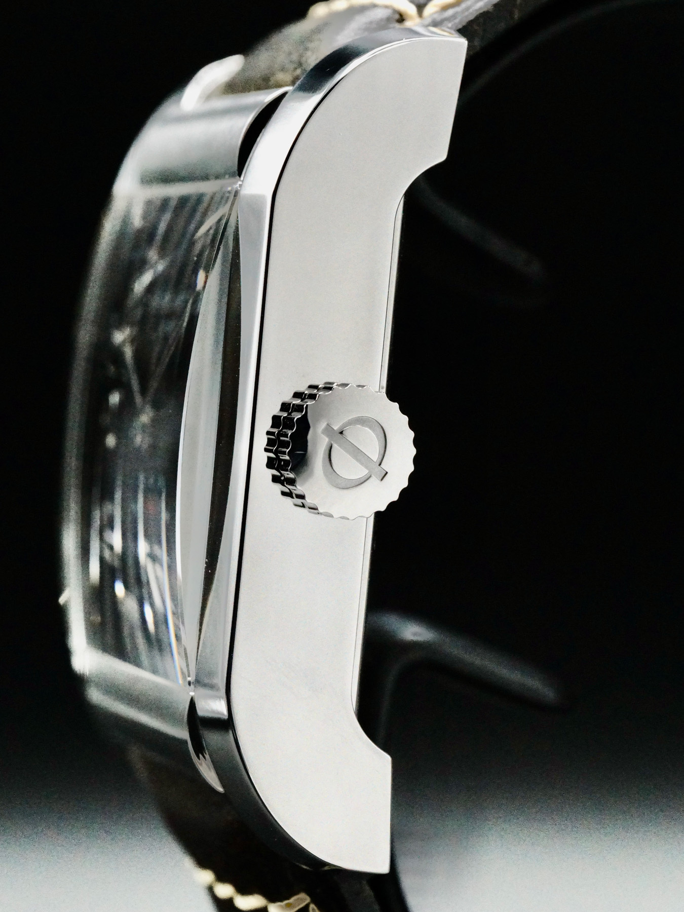 This watch features a 45 x 32.3mm stainless steel case on leather strap. This watch also sports a grey dial. Powered by a Mechanical automatic movement. Water resistance up to 50 meters.