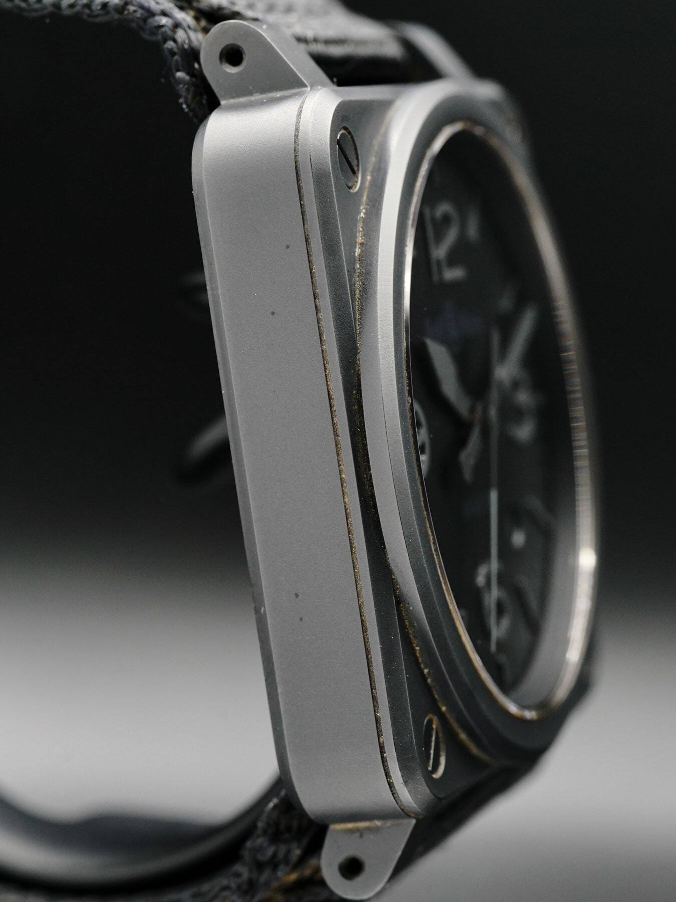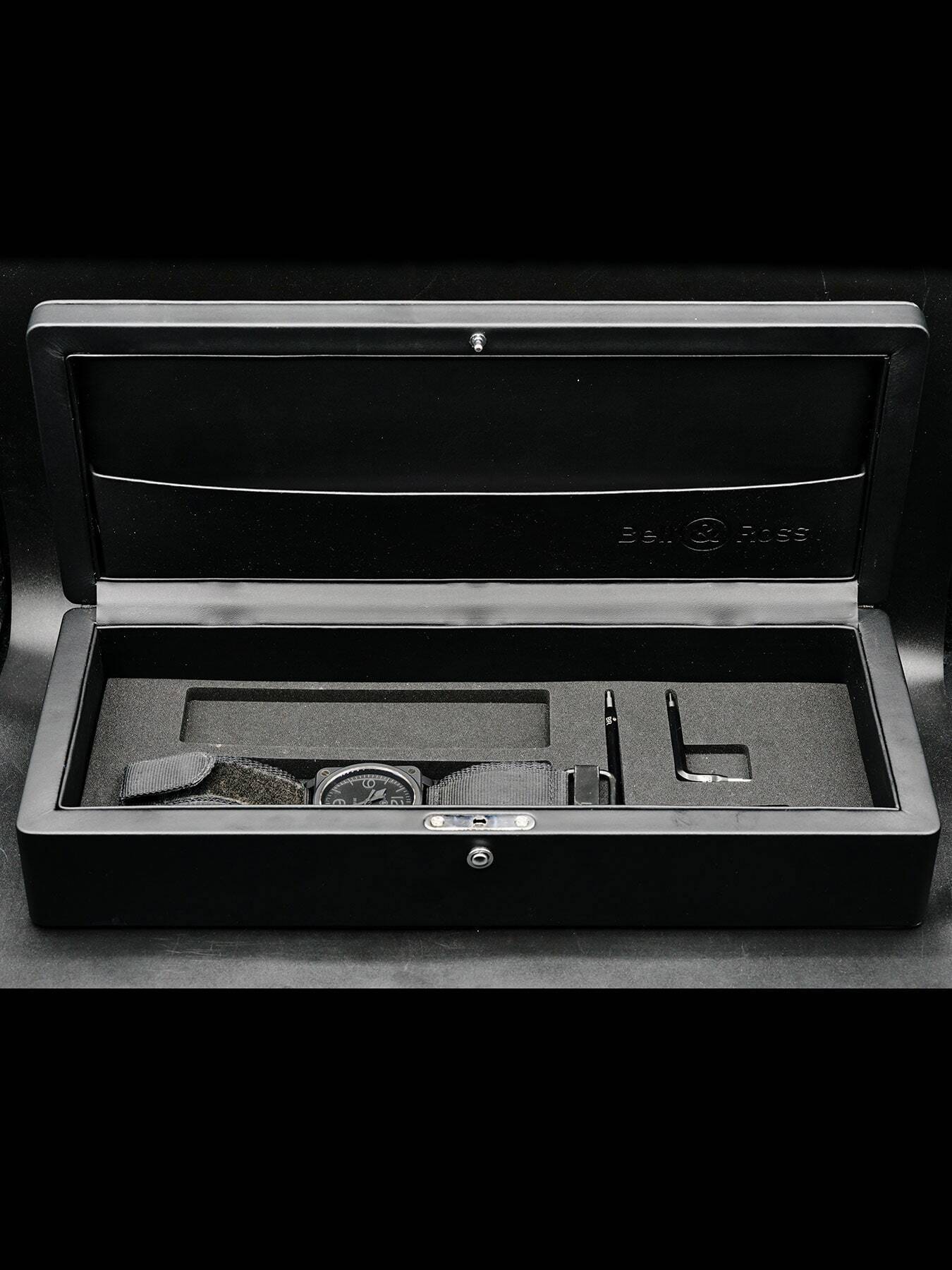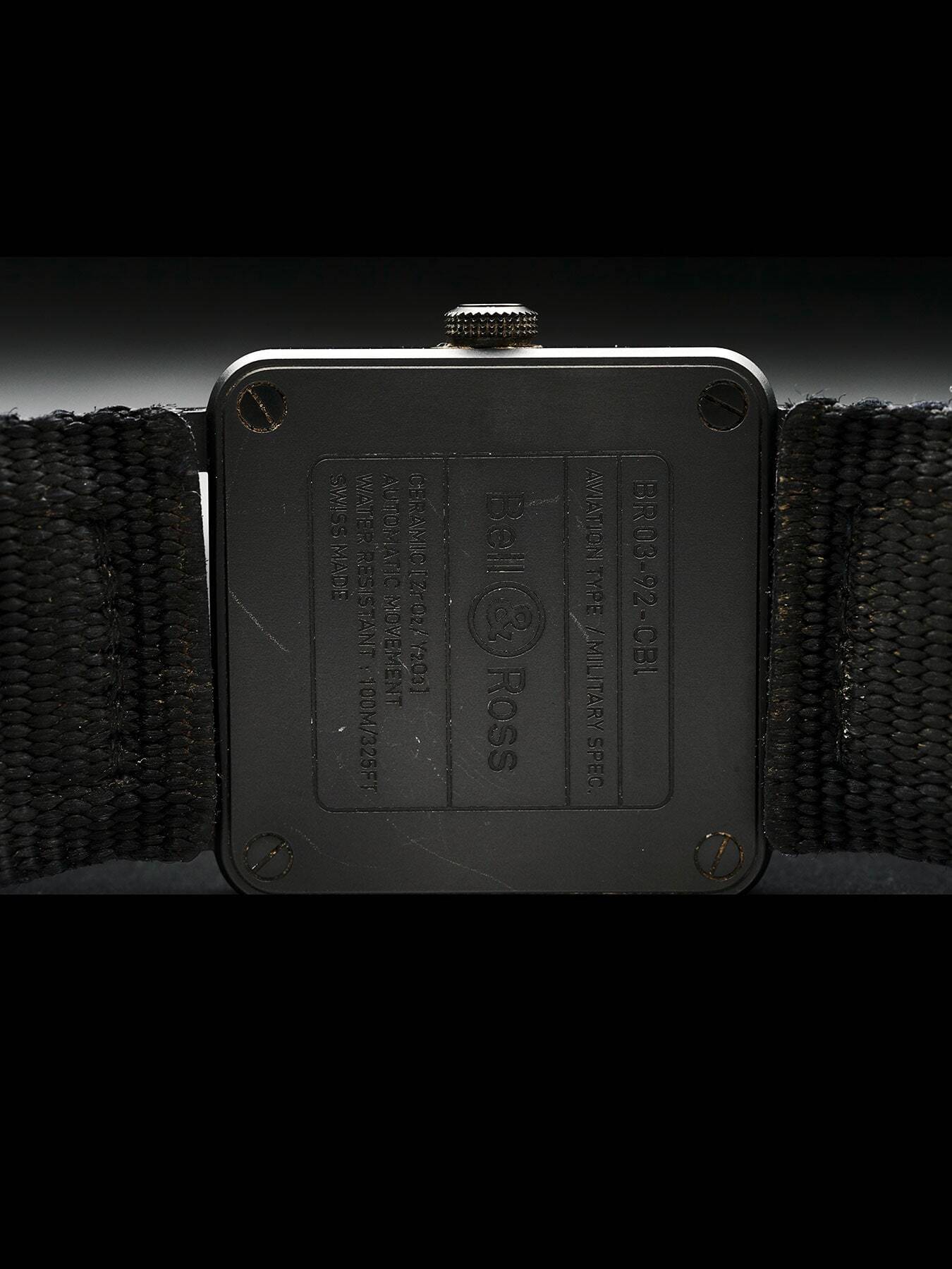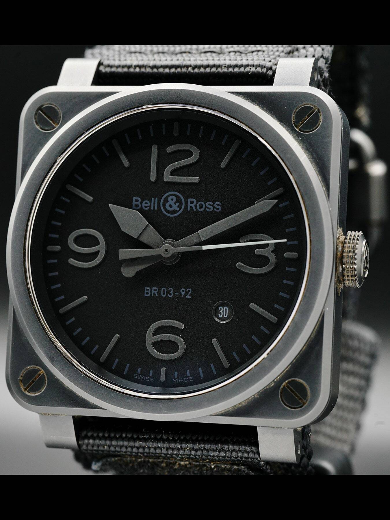 This Bell & Ross BR 03-92 PHANTOM features a 42mm matte black ceramic case with a solid case back on a black synthetic fabric strap. This watch also sports a black dial with black hands and index & Arabic numeral dial markers covered by scratch resistant sapphire crystal.