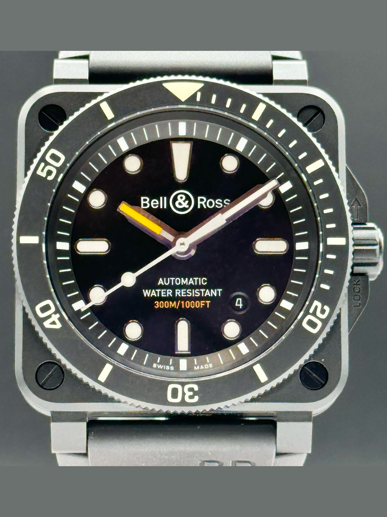 This Bell & Ross BR0392-D-BL-CE/SRB is in EXCELLENT condition. This watch includes its original box, instructions, and warranty card dated for June 2024. Extra black fabric strap. This watch has been fully authenticated and certified by Exquisite Timepieces.