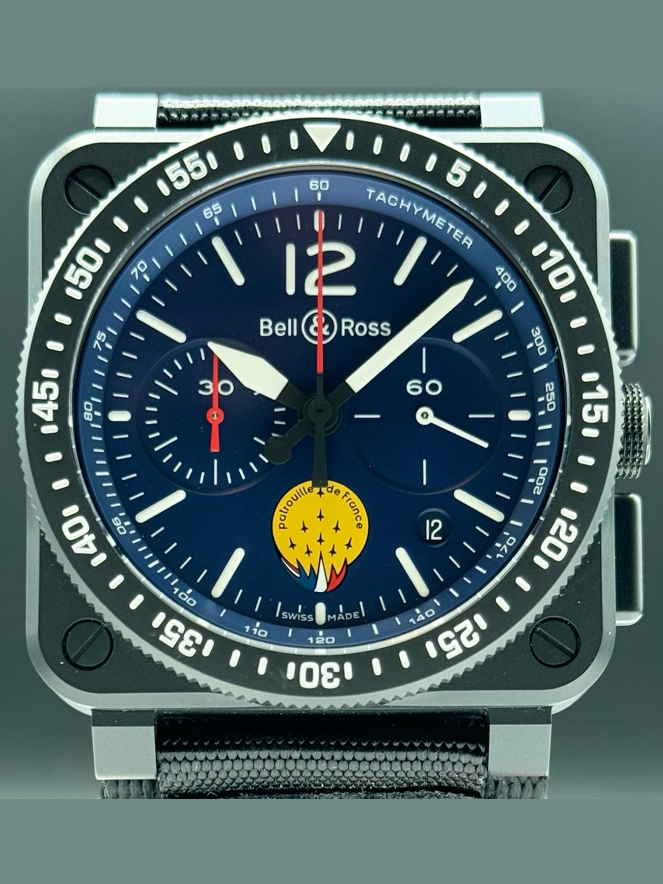 This Bell & Ross Patrouille de France features a 42mm matte black ceramic case with a solid case back on a black fabric strap. This watch also sports a blue dial, Patrouille de France logo at 6 o'clock, numerals and indices painted in Super-LumiNova®, metal skeletonised Super-LumiNova®-filled hour and minute hands covered by sapphire crystal.