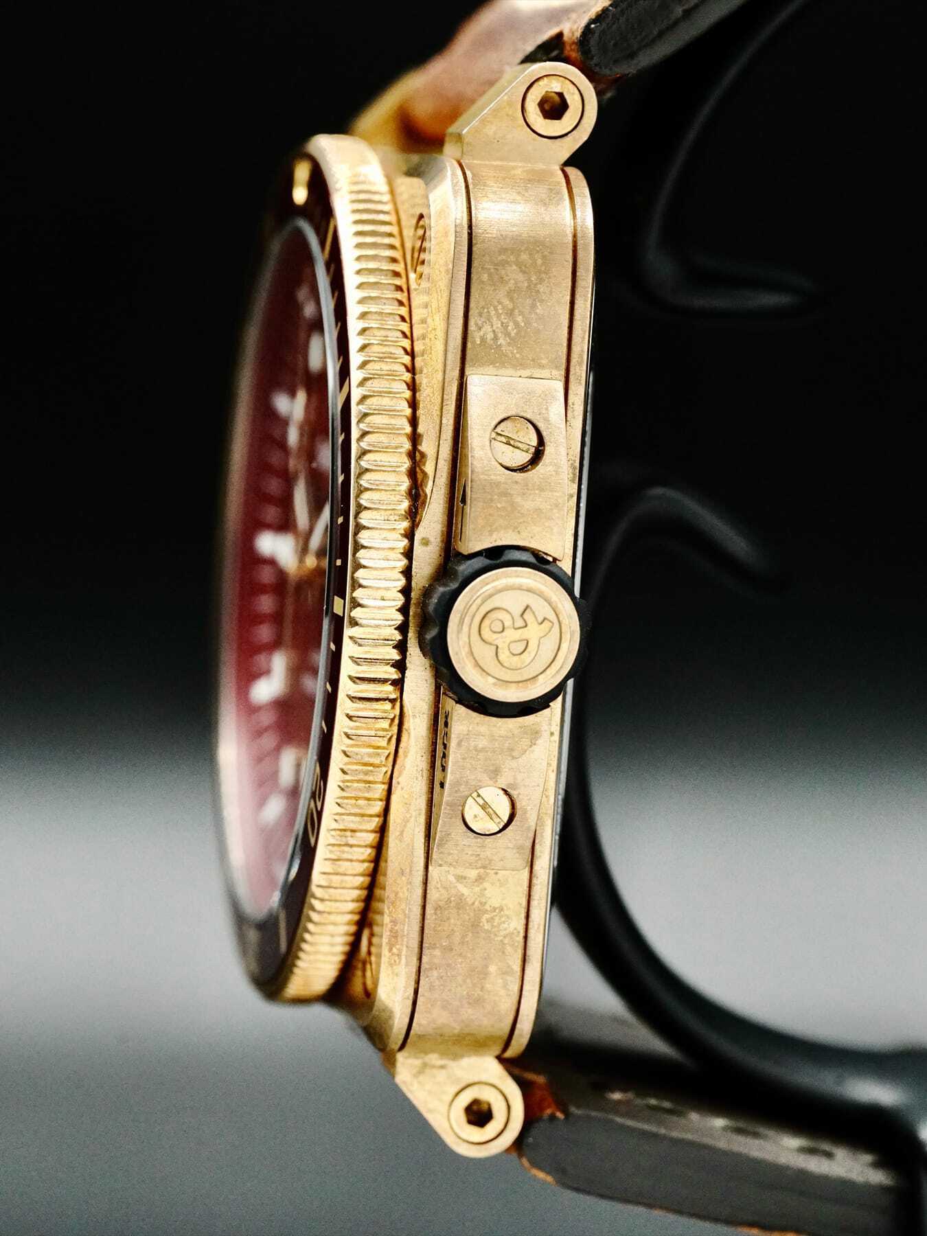 This watch features a 42mm bronze case. This watch also sports a red dial.
