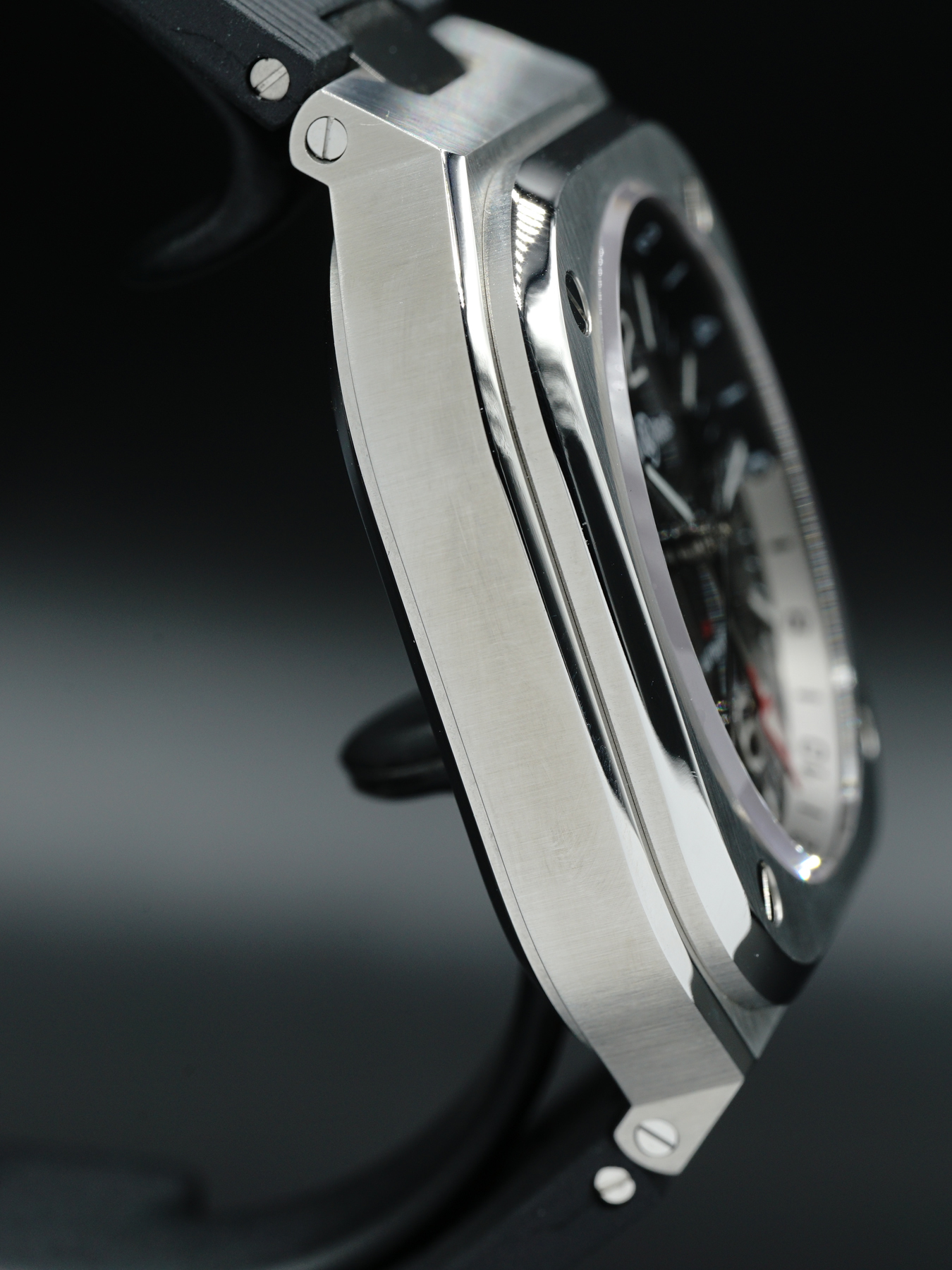 - This timepiece features a 41mm steel case paired with a high quality rubber strap. It showcases a distinctive black dial and is powered by a precise automatic winding movement. The watch is designed with a water resistance of up to 100m.