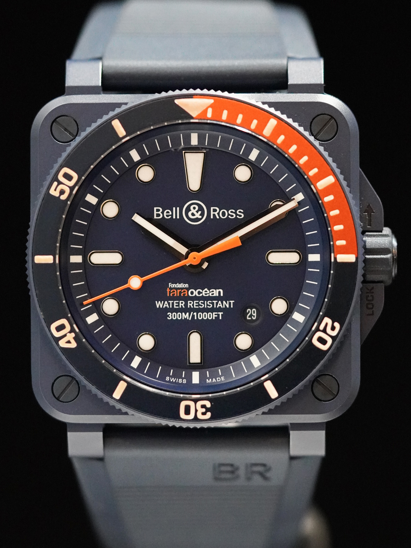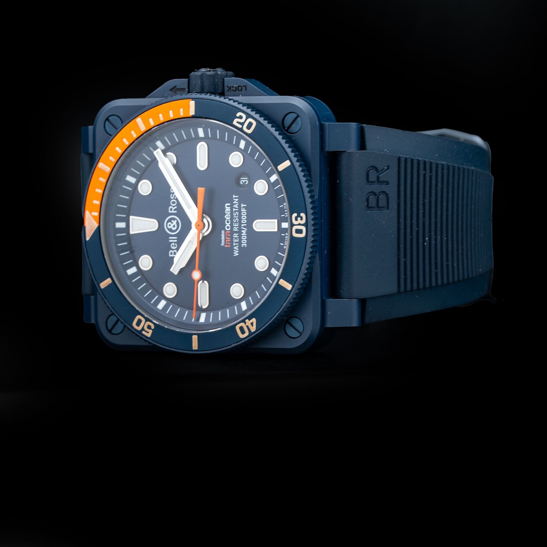 This watch features a 42mm ceramic case on rubber strap. This watch also sports a blue dial. Powered by a mechanical automatic movement. Water resistance up to 300 meters.