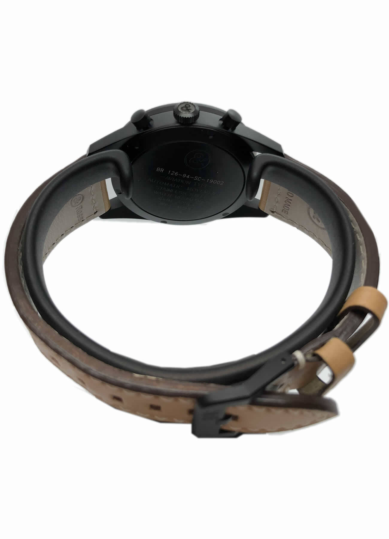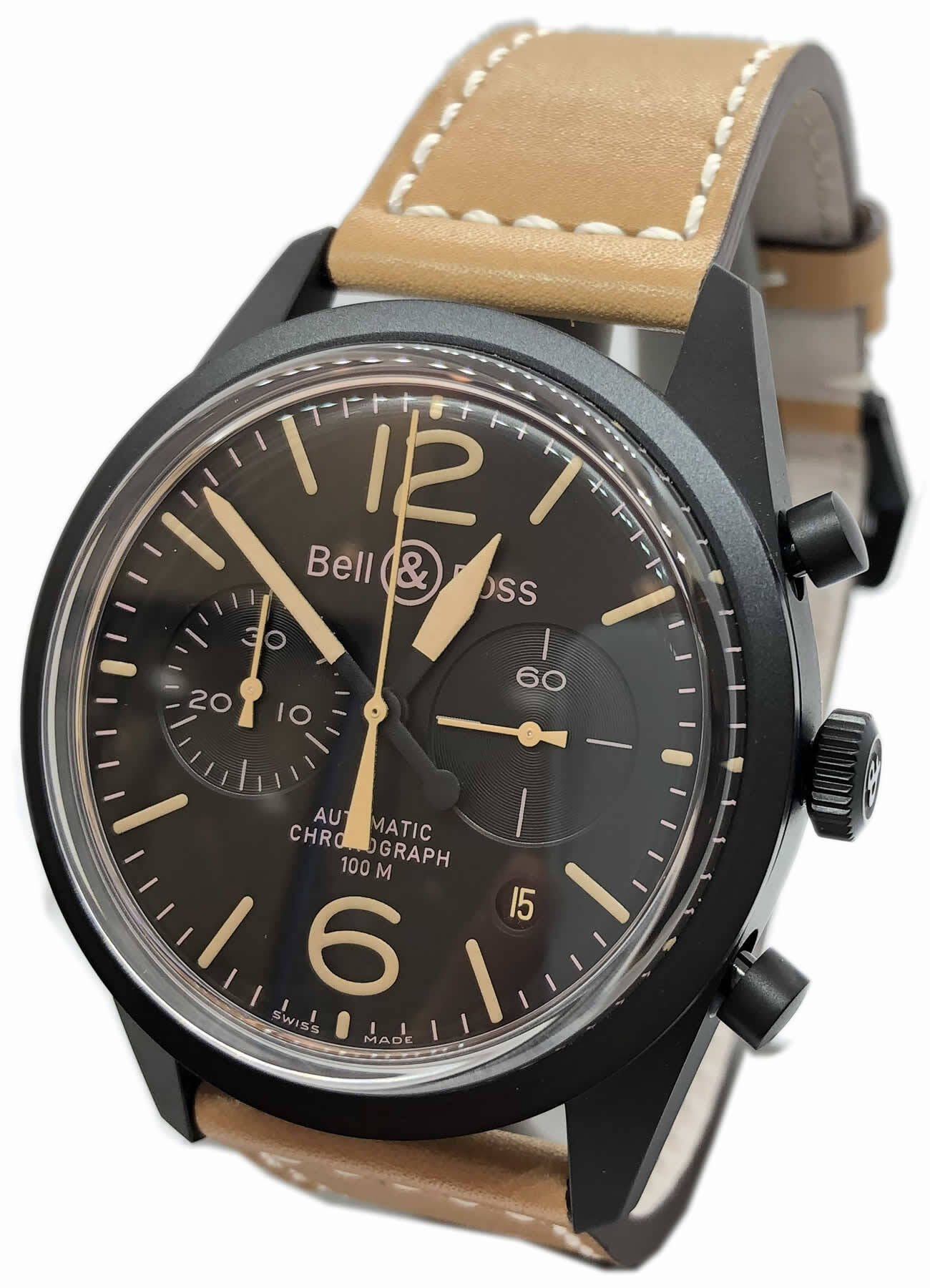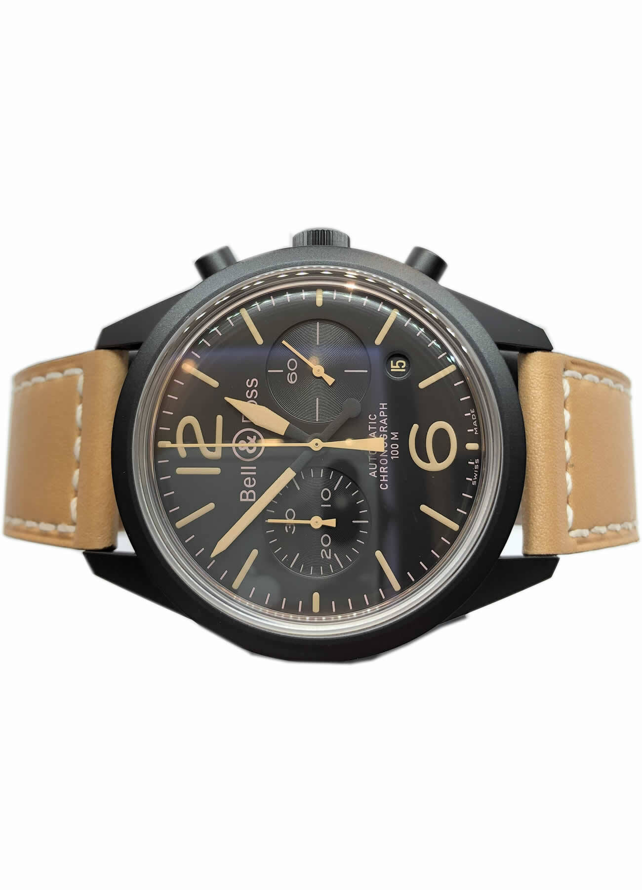 This Bell & Ross Vintage BR 126 Heritage watch features a 41mm carbon-blackened 316L stainless steel case, a galvanic matte black dial with sand-colored photoluminous hands and hour markers for optimal night legibility, a curved anti-glare sapphire crystal, and a natural leather strap. The Bell & Ross Vintage BR 126 Heritage watch is powered by an automatic movement with chronograph and date functions. It is water resistant to 100 meters.