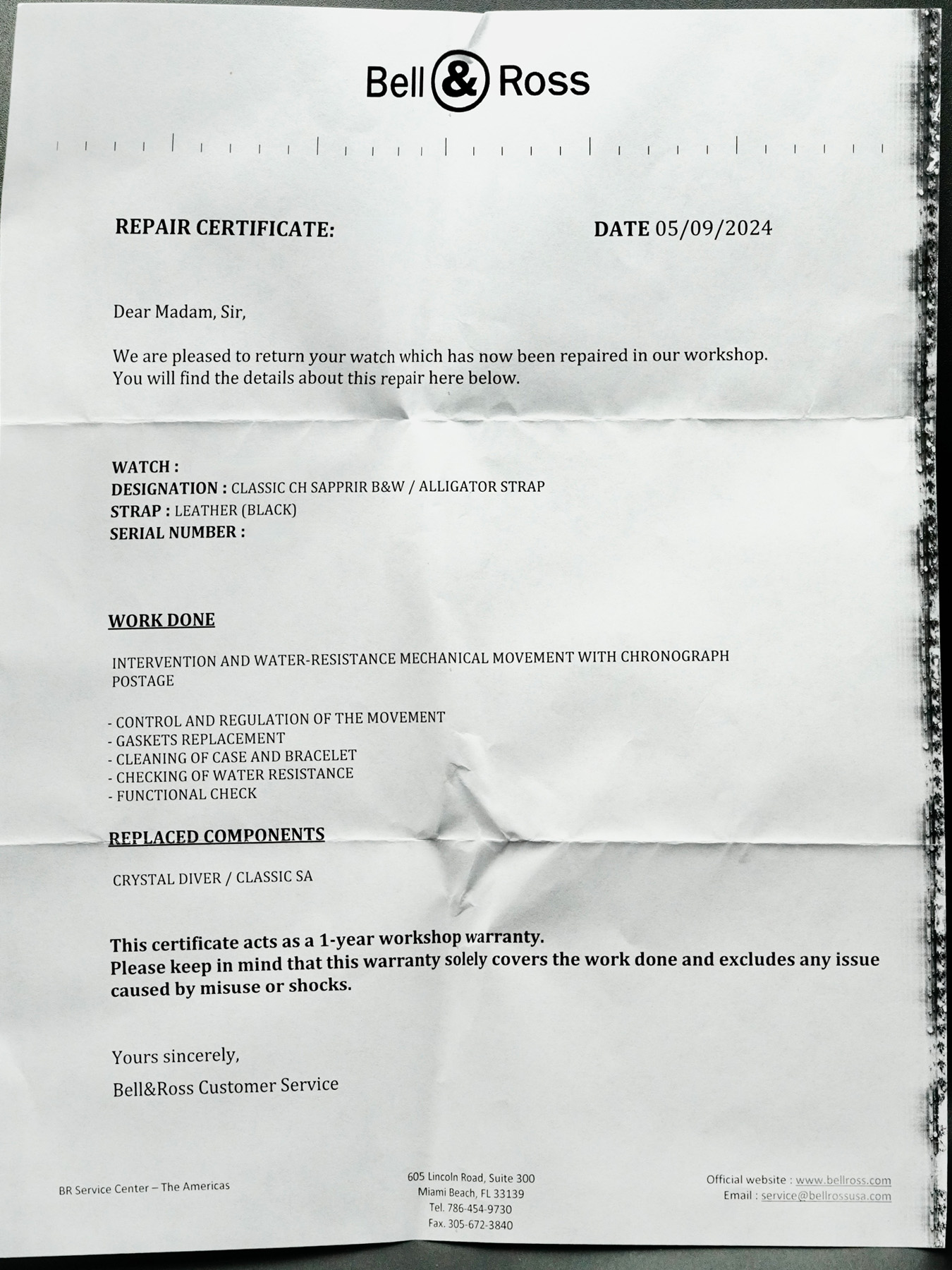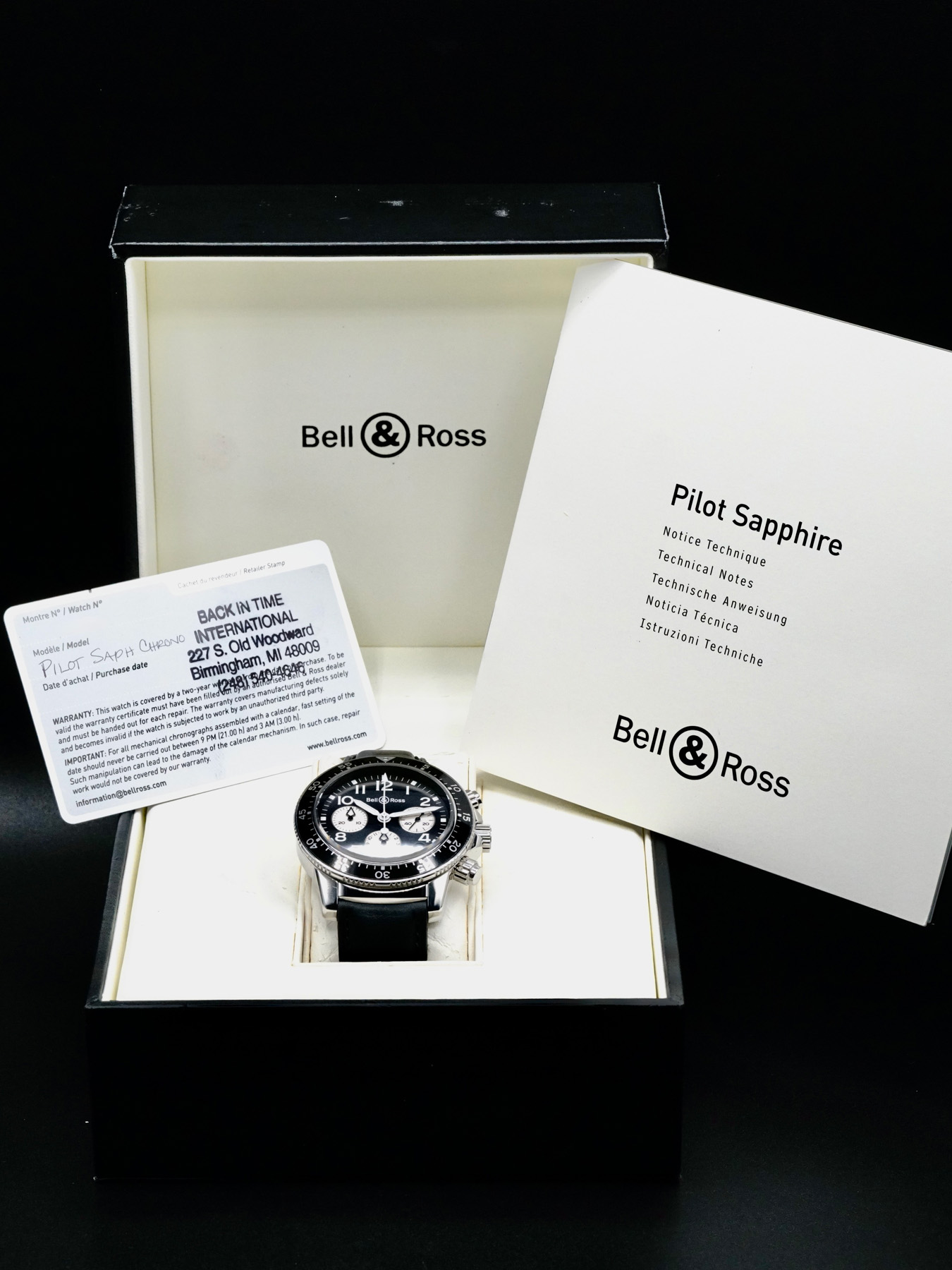 This Bell & Ross Pilot Sapphire Chrono is in EXCELLENT condition. This watch includes its original box, instruction manual, and warranty card not dated. Bell & Ross Repair Certificate dated for May 9th, 2024 and is guaranteed for 1 year from the date of service. This watch has been fully authenticated and certified by Exquisite Timepieces.