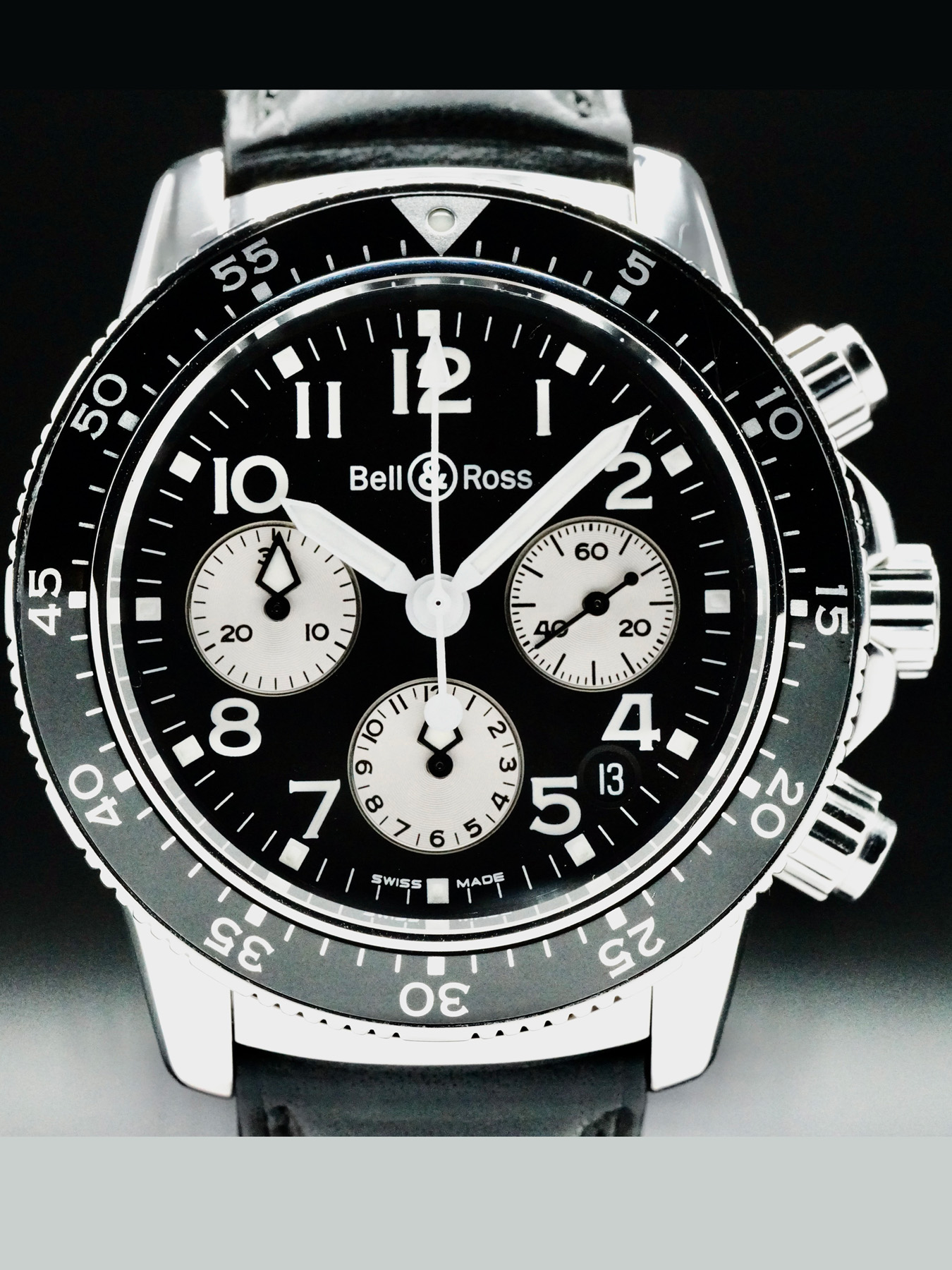 This Bell & Ross Pilot Sapphire Chrono features a 40mm stainless steel case with a display case back on a black leather strap. This watch also sports a black dial with luminous hands and Arabic numeral dial markers covered by sapphire crystal.