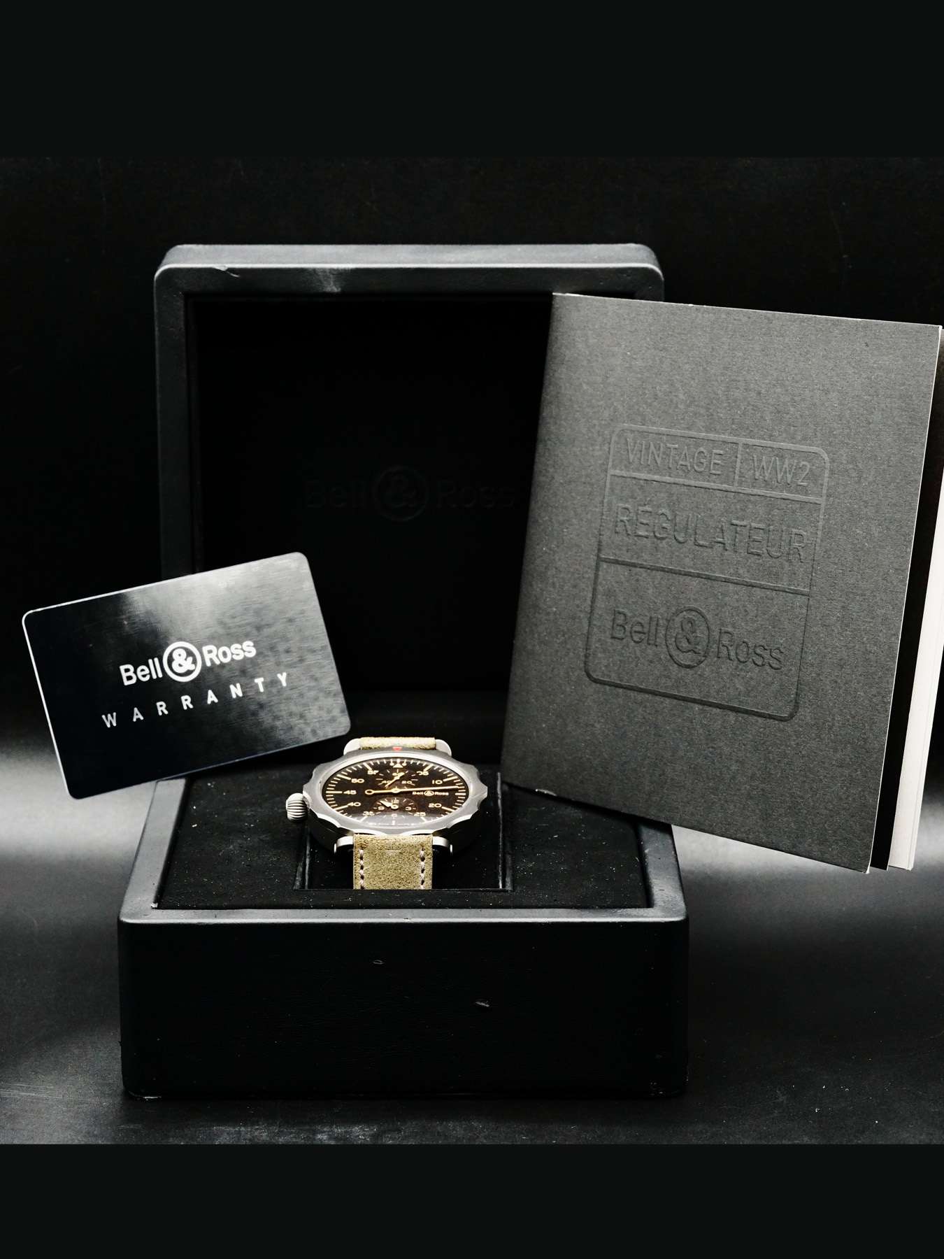 This Bell & Ross Vintage Regulator WW2 Bomber BR WW2-71-SP is in EXCELLENT condition. It has box and papers.