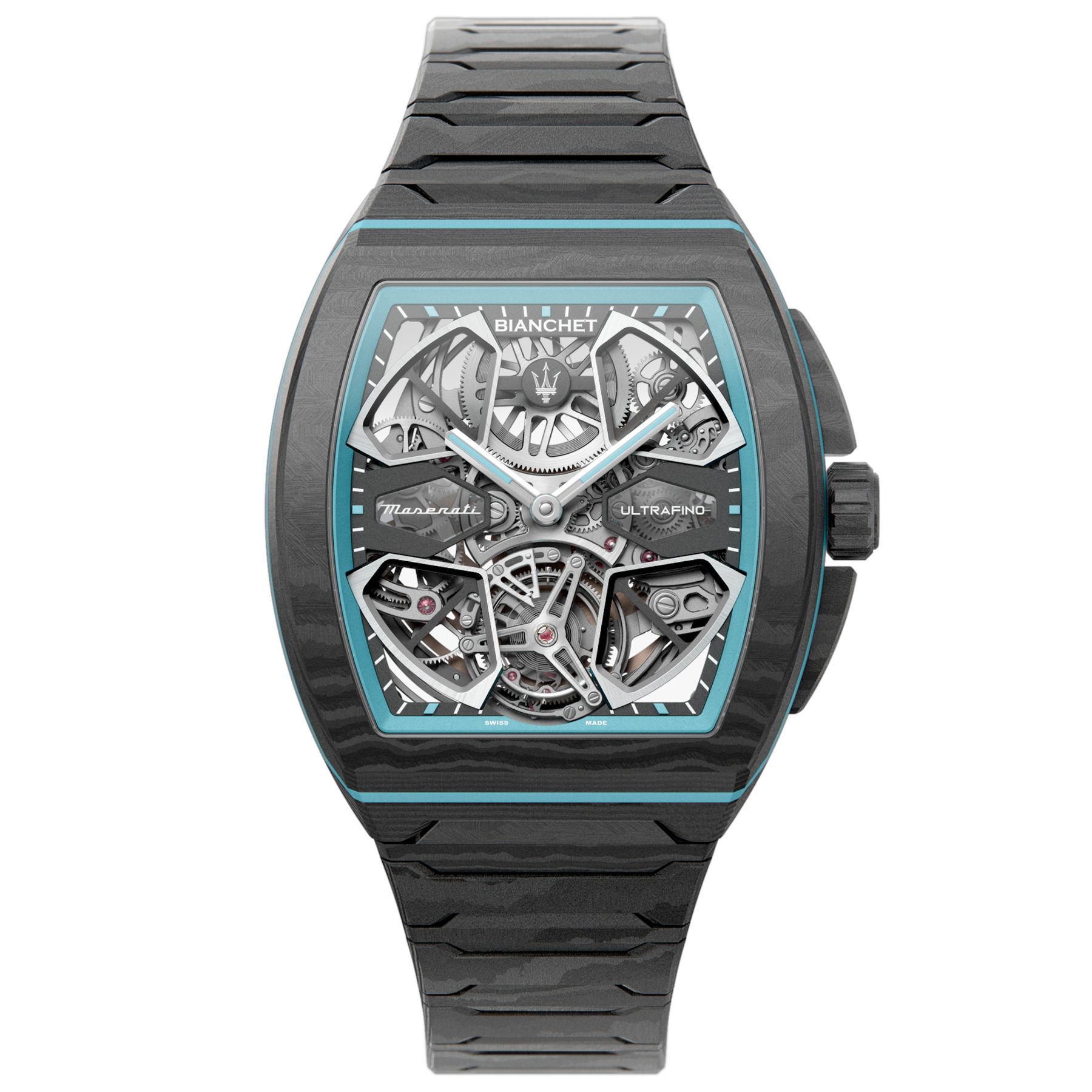 The Ultrafino Maserati is a limited-edition model born of a century of Trident heritage. Its design draws from the soul of Maserati's supercar lineup, the rim architecture, and the AquaRainbow color of the MCPURA. Carbon fiber runs through the DNA of both Maisons, and here it finds its most refined expression.