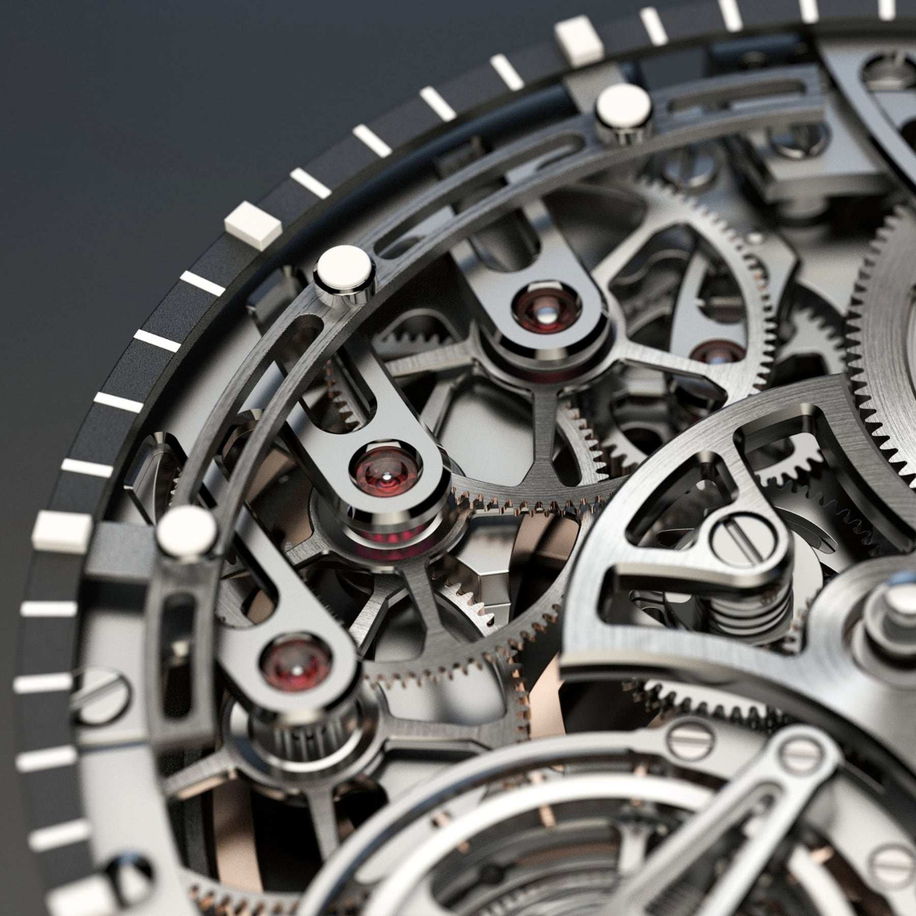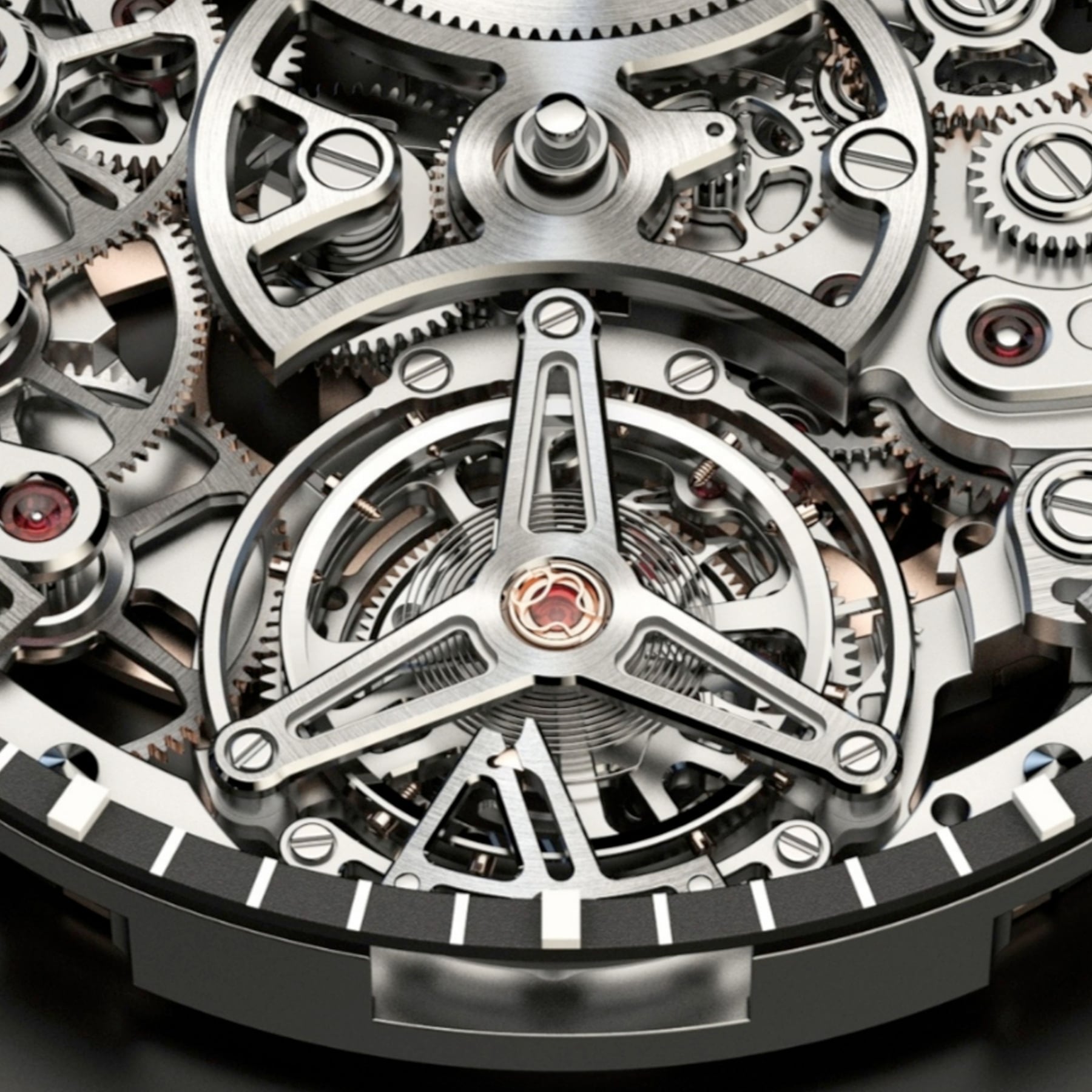 At the core of the movement lies a flying barrel, the ratchet wheel integrated directly into the drum, eliminating unnecessary layers and allowing the barrel cover to drive the gear train.