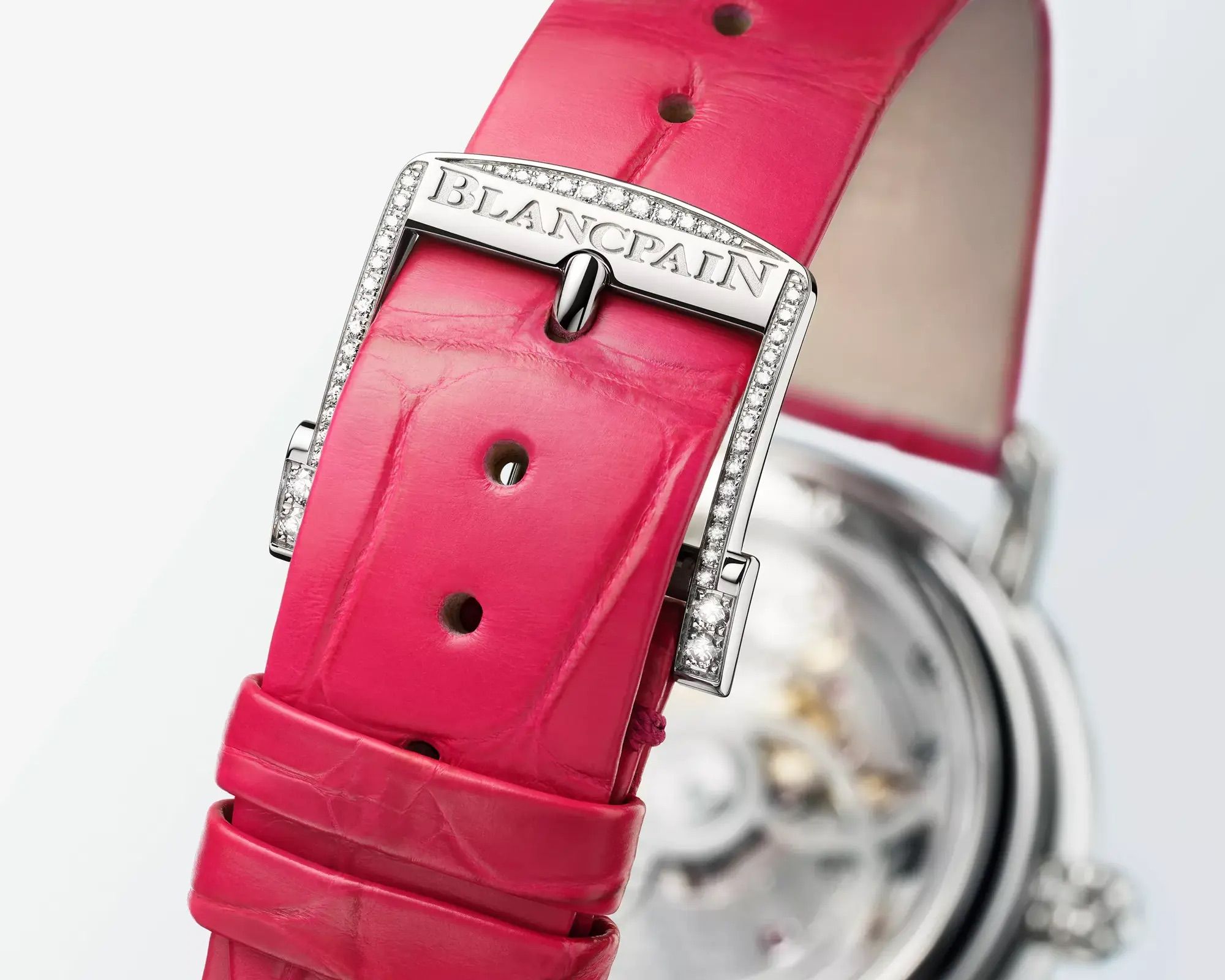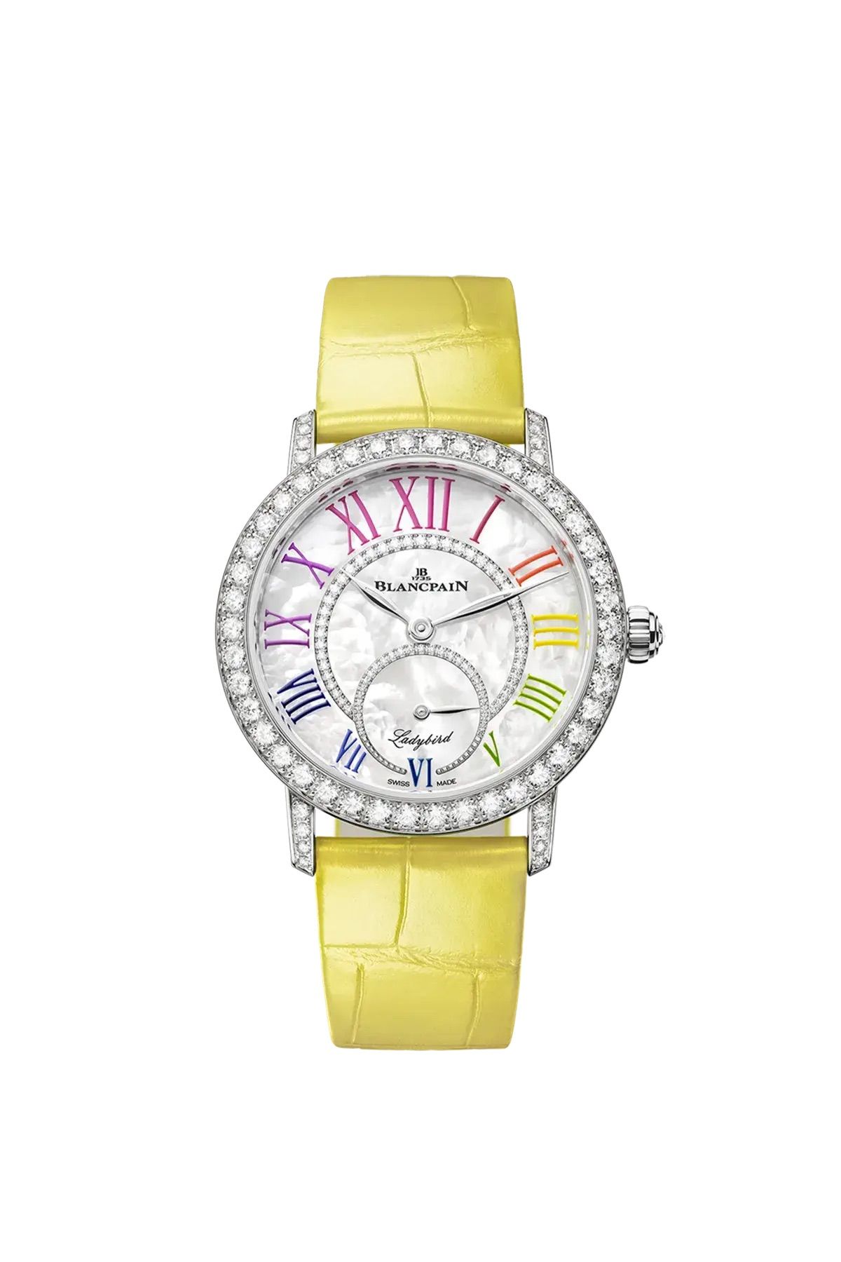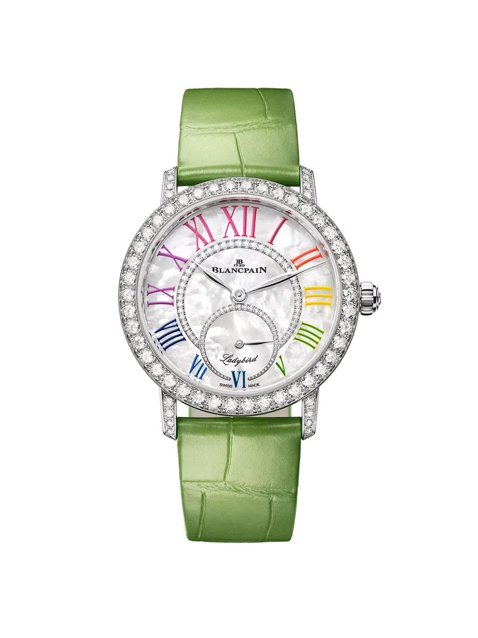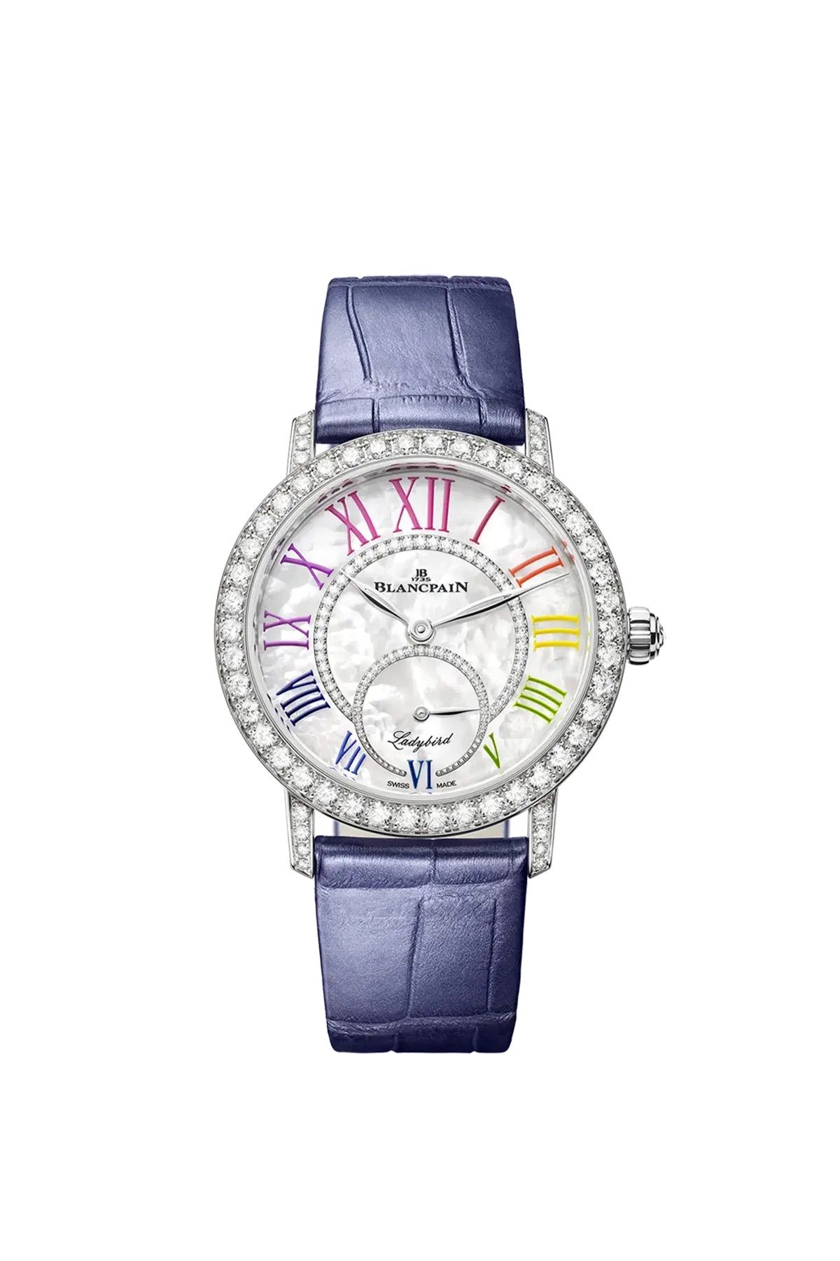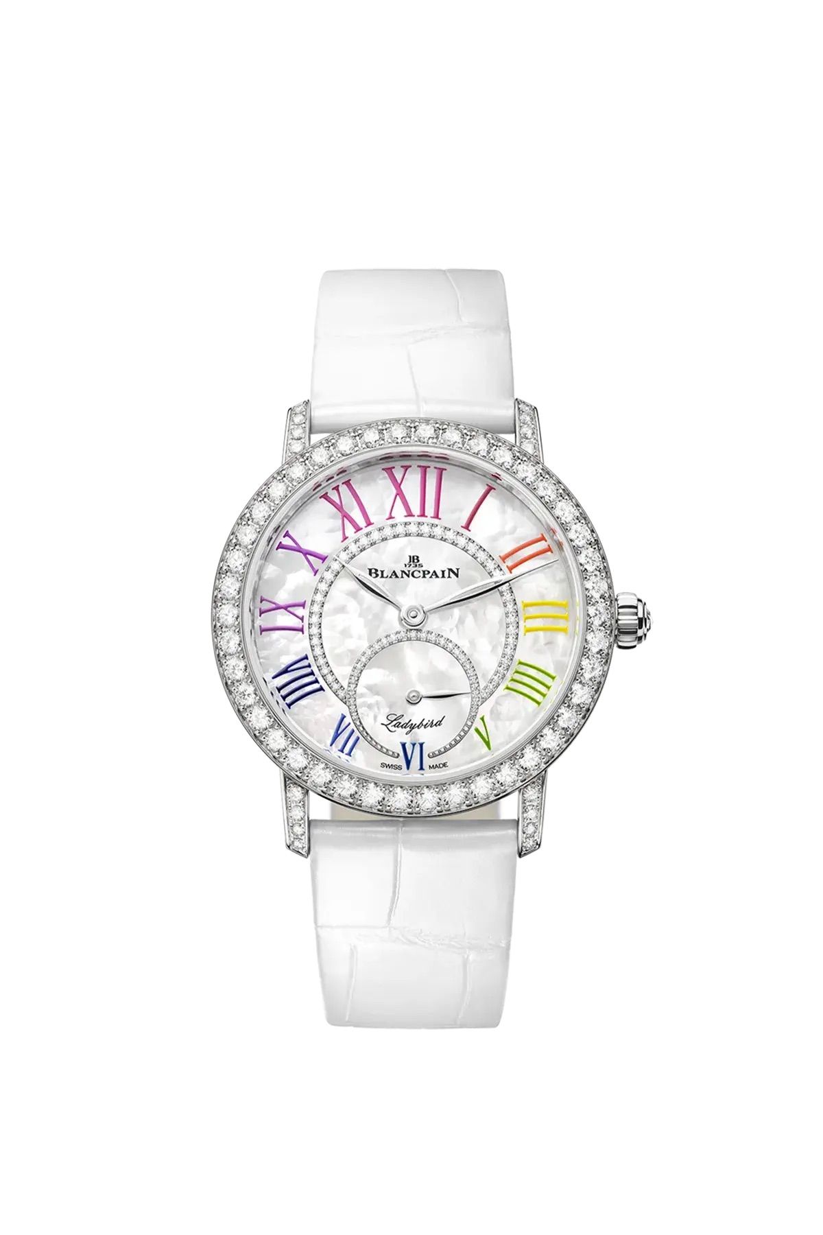 Discover the Blancpain Ladybird Colors 3661A-1954-95A – a dazzling ladies’ watch featuring a diamond-set white gold case, mother-of-pearl dial, and automatic movement. Elegant, refined, and timeless.