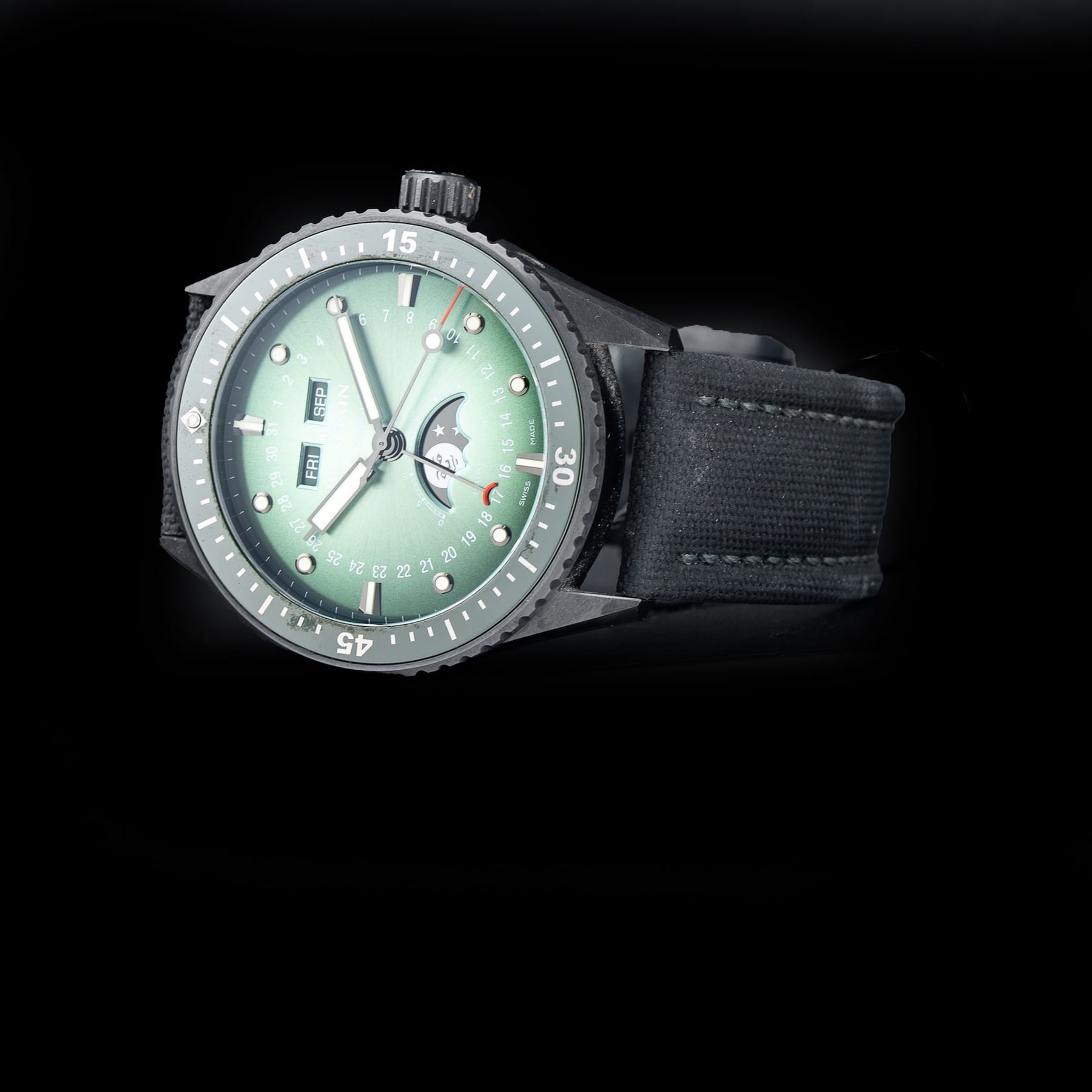 This watch features a 43.6mm ceramic case on sail canvas strap. This watch also sports a green dial. Powered by a mechanical movement. Water resistance up to 300 meters.