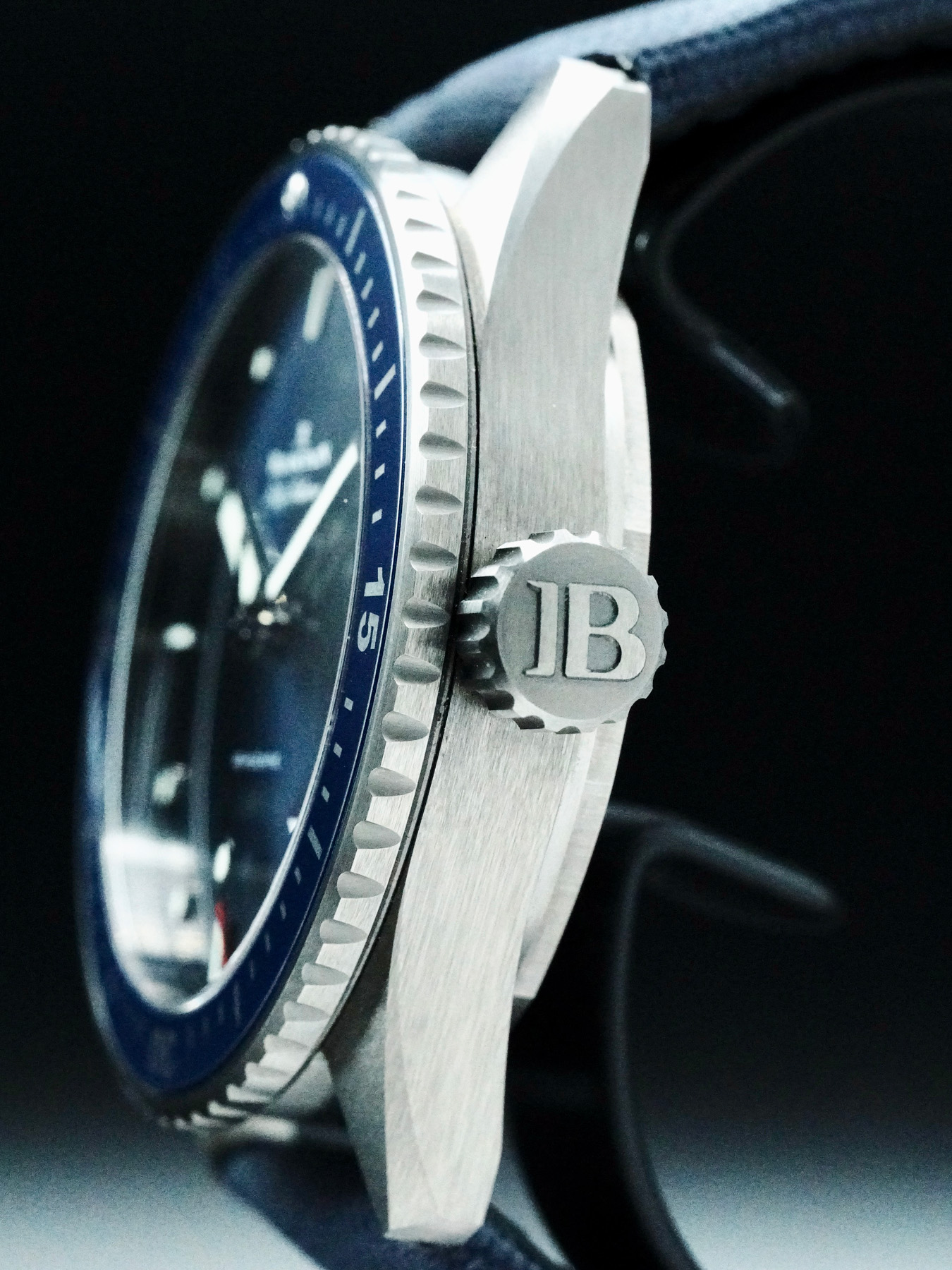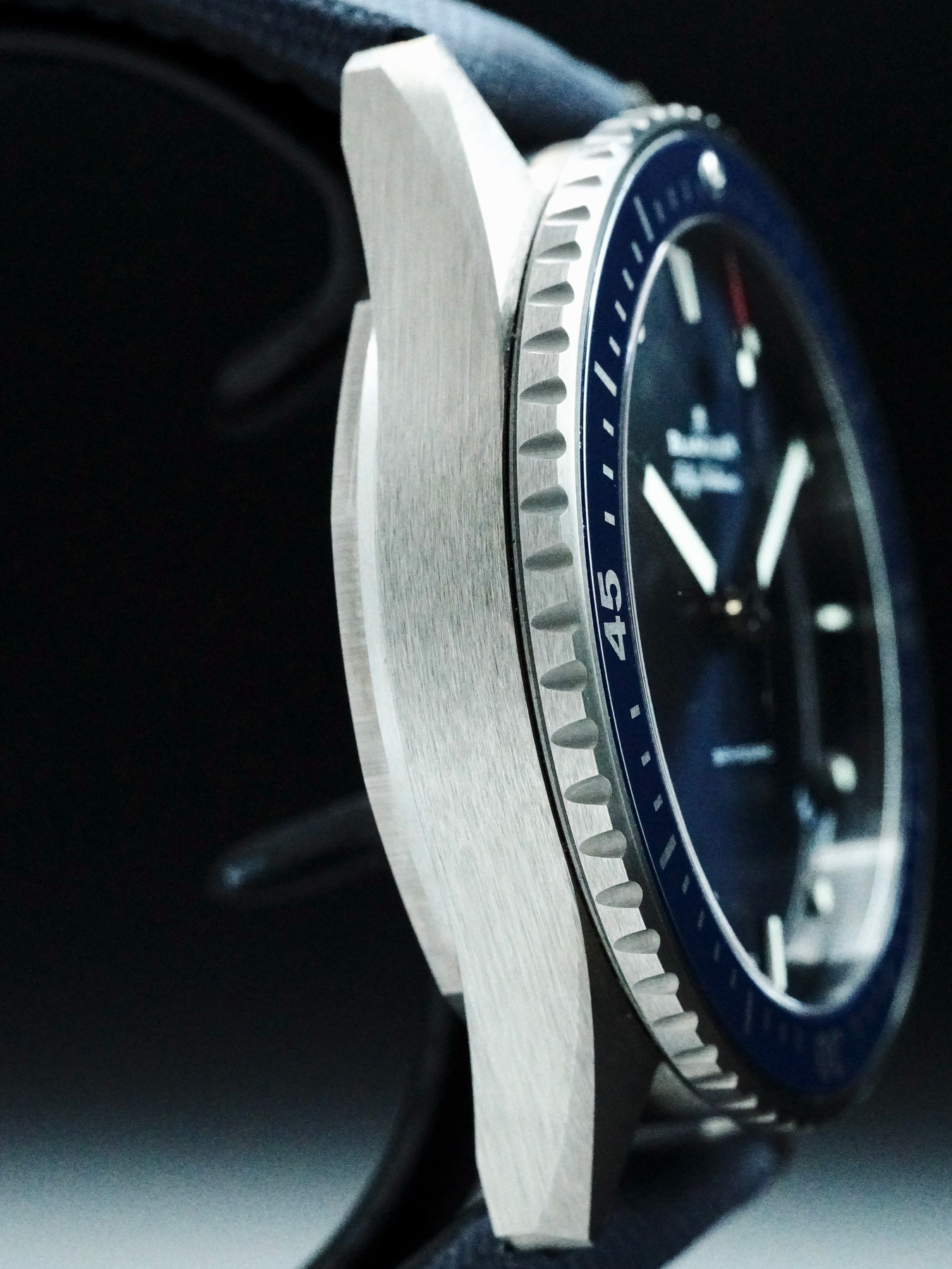This Blancpain Fifty Fathoms Bathyscaphe features a 43mm gray plasma ceramic case with an exhibition case back on a blue textile strap. This watch also sports a blue dial with luminous hands and index dial markers covered by scratch resistant sapphire crystal.