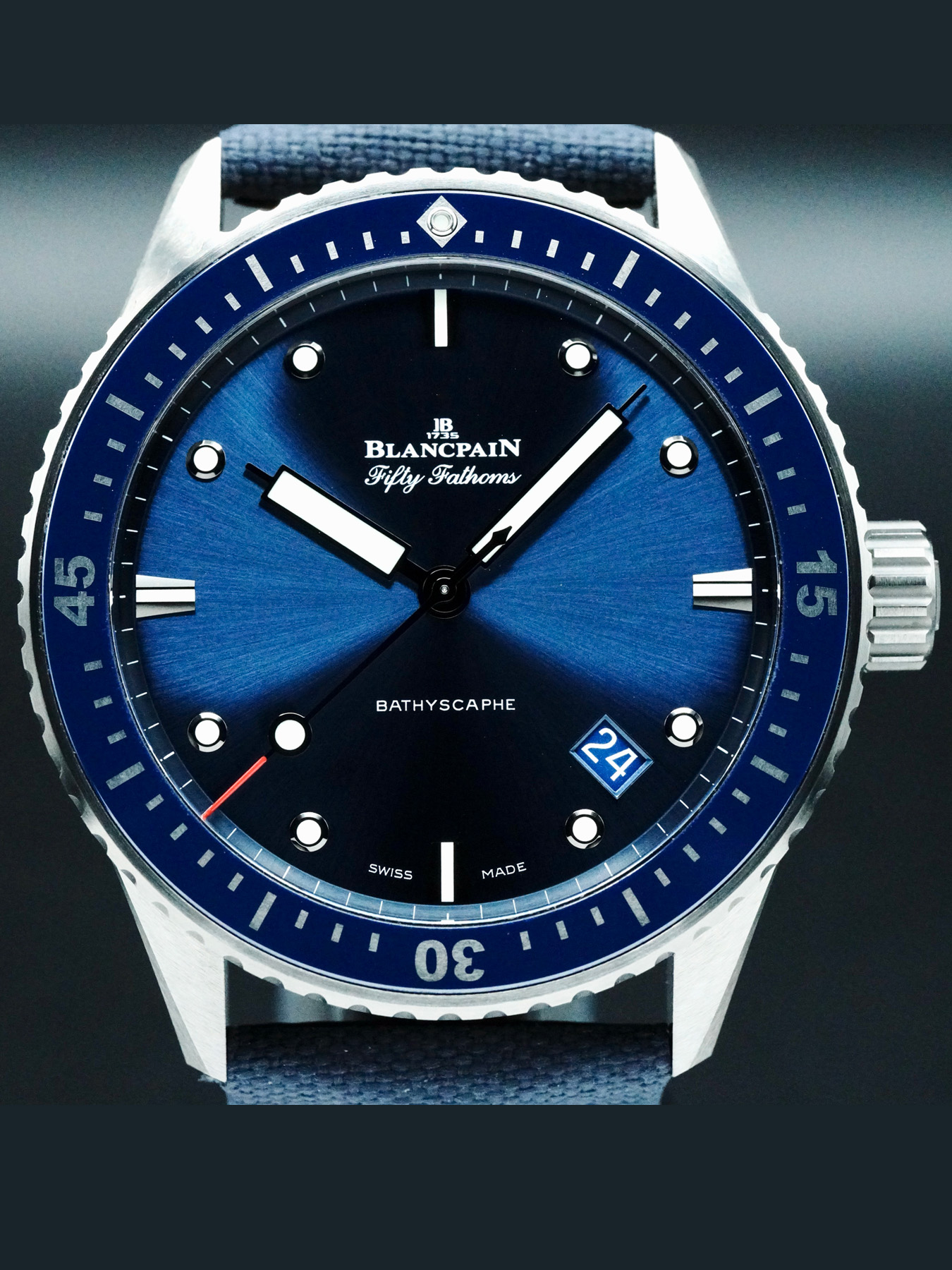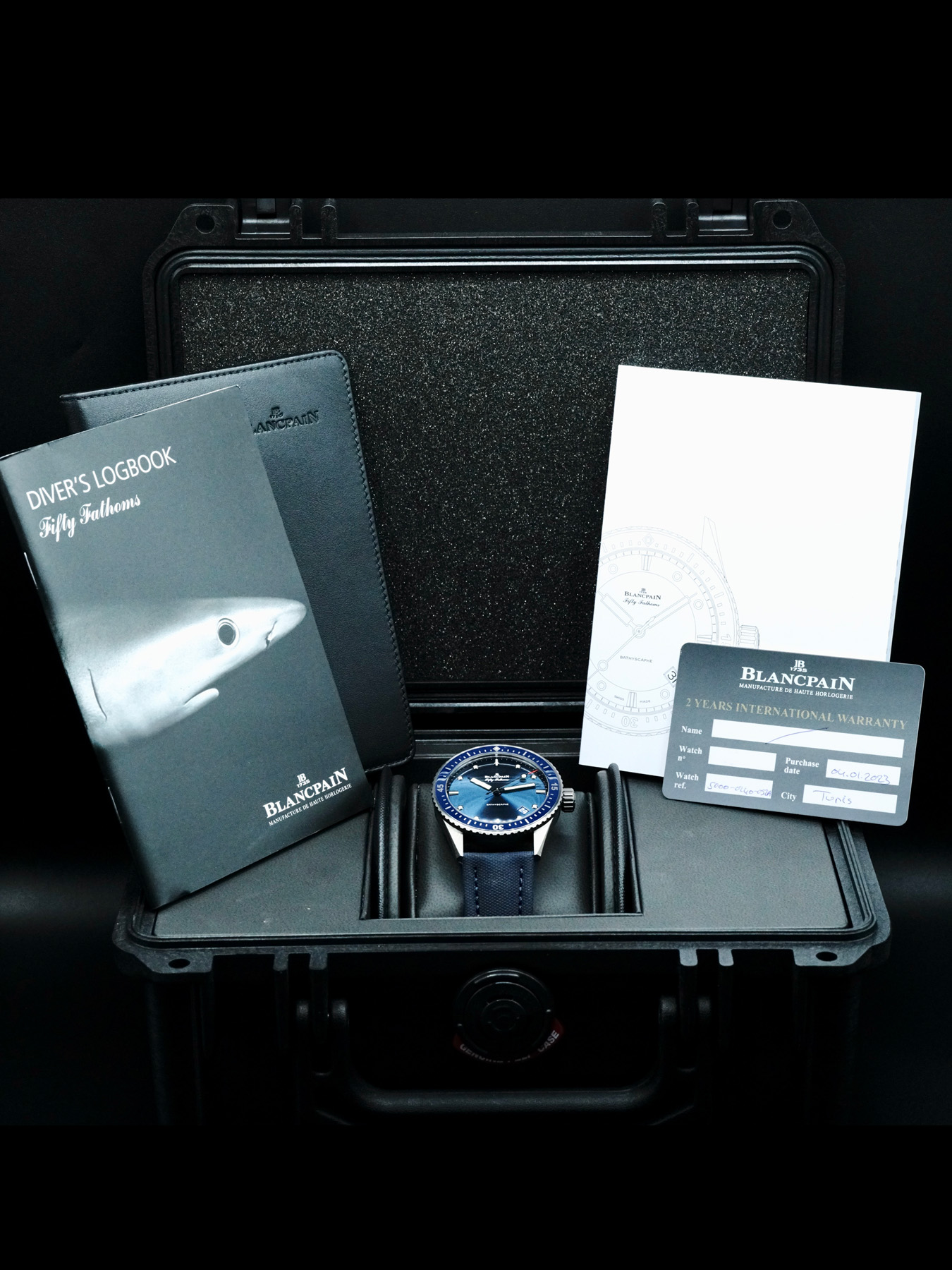 This Blancpain Fifty Fathoms Bathyscaphe 5000-0260-052A is in EXCELLENT condition. This watch includes its original box, instruction manual, and warranty card dated for 2023. This watch has been fully authenticated and certified by Exquisite Timepieces.