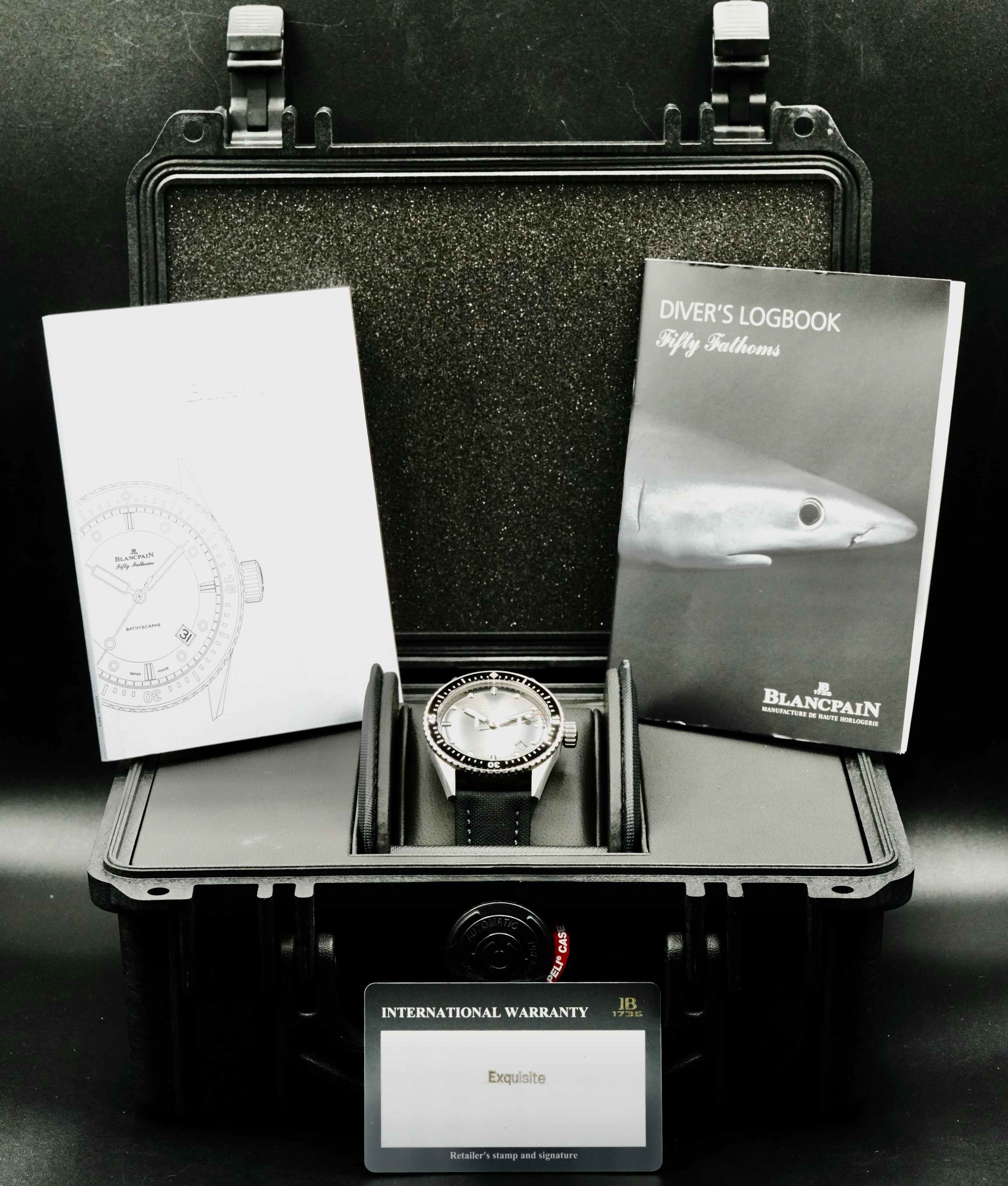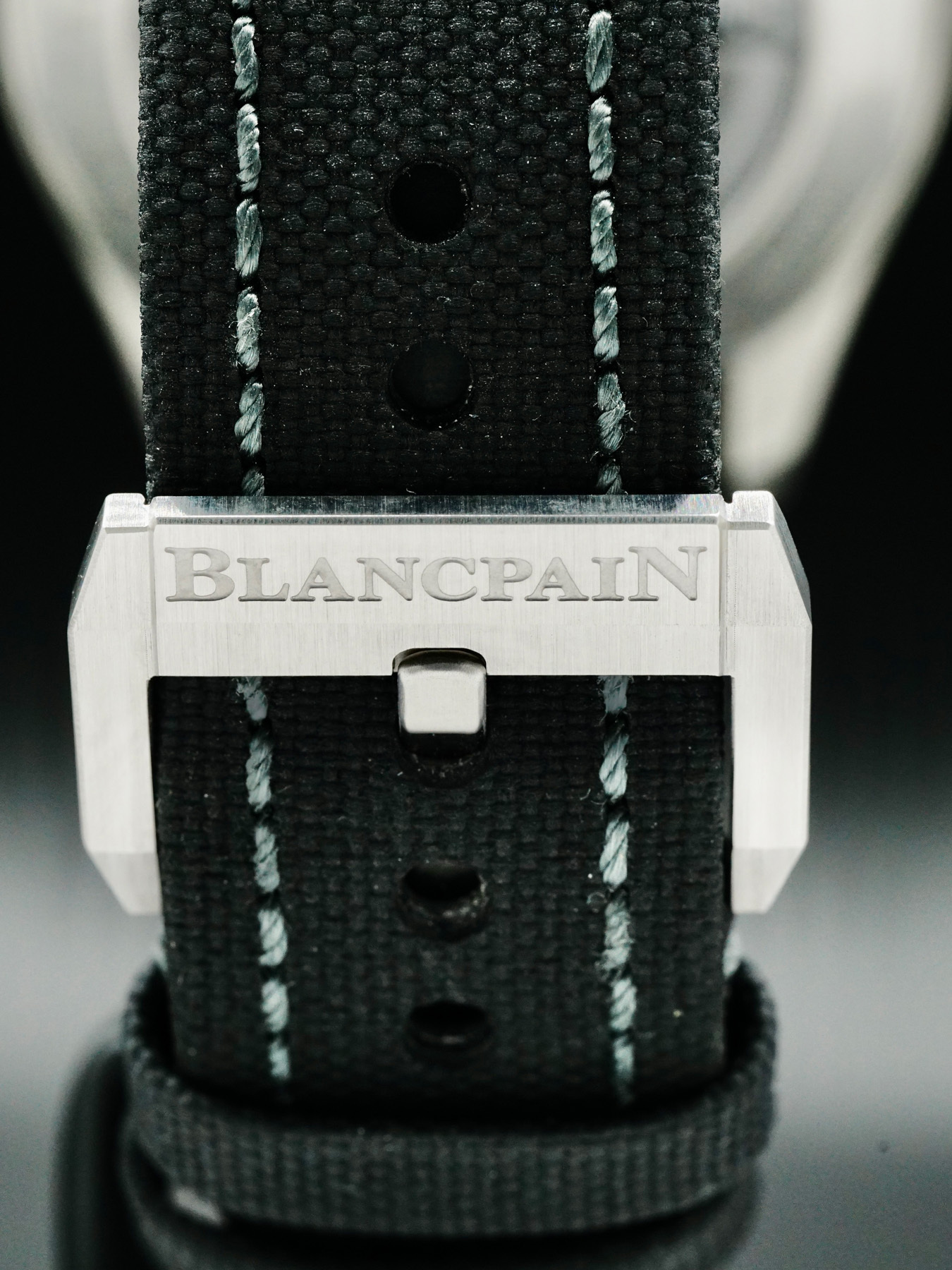 This Blancpain Fifty Fathoms Bathyscaphe 5000-1110-B52A is in EXCELLENT condition. This watch includes its original box, instruction booklets, and international warranty dated for September 2023. Extra black sail canvas strap. This watch has been fully authenticated and certified by Exquisite Timepieces.