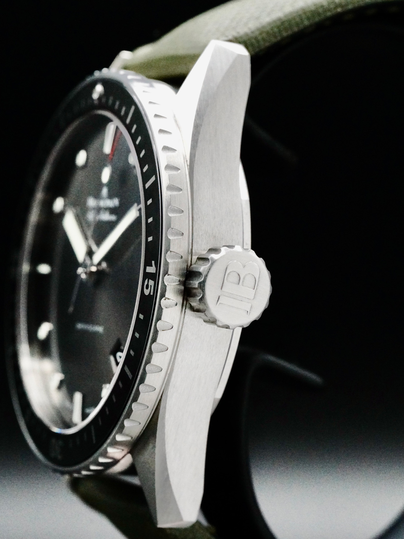 This watch features a 43 mm steel case on sail-canvas strap. This watch also sports a grey meteor dial. Powered by an automatic movement. Water resistance up to 300 meters.