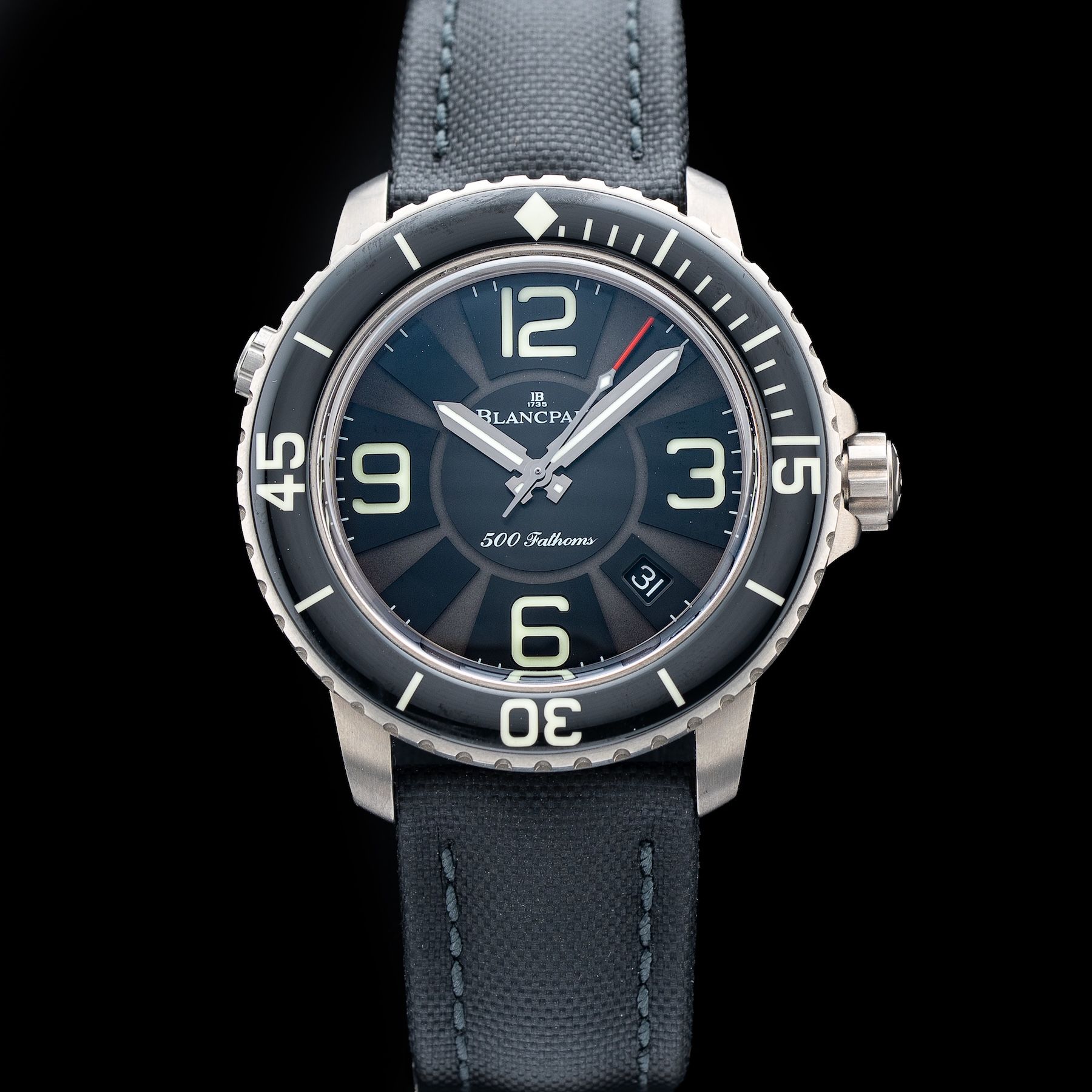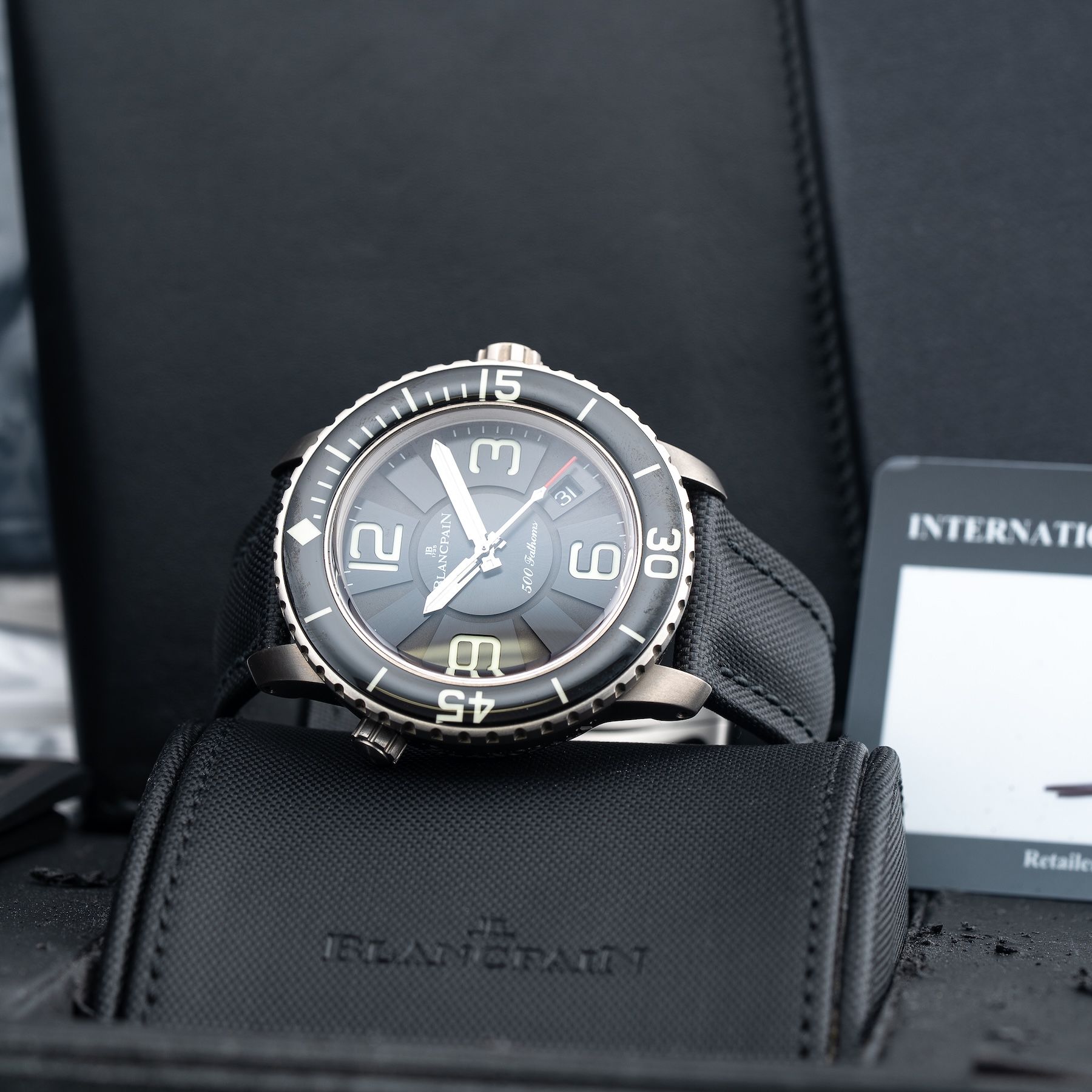 This Blancpain 50015-12B30-52B Sport 500 Fathoms is in GREAT condition, it has box, papers and warranty card not dated. Extra rubber strap. box leather is aged. This watch has been fully authenticated and certified by Exquisite Timepieces. Please note, the photos shown are of the actual watch you will receive.