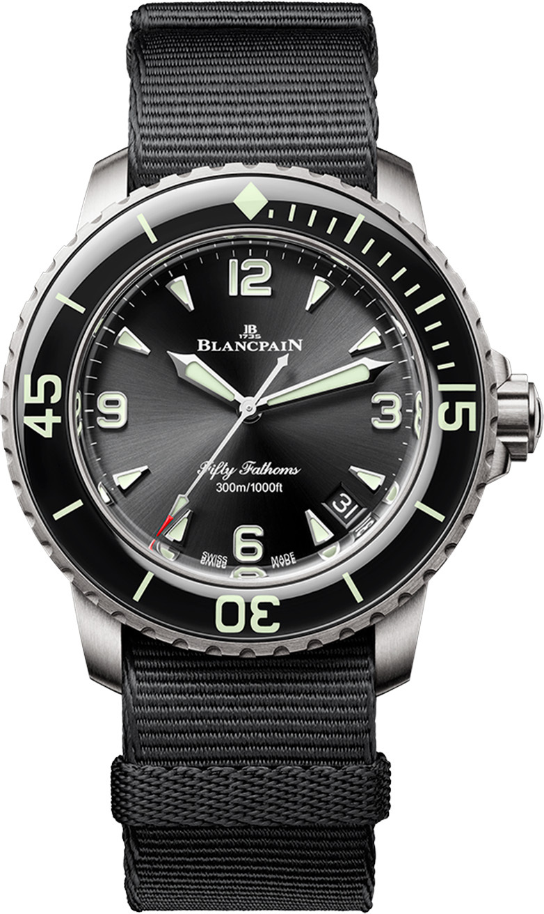Embrace the pinnacle of dive watch craftsmanship with the Blancpain Fifty Fathoms Automatique 5010-12B30-NABA, a testament to the seamless blend of form and function. Crafted from satin-brushed titanium, this watch is a beacon of durability, designed to withstand the rigors of underwater exploration without compromising on elegance. It features a mesmerizing sunburst black dial, complemented by a unidirectional sapphire bezel, ensuring legibility in the deepest waters. Powered by the exceptional self-winding Calibre 1315, known for its substantial 120-hour power reserve, it stands as a reliable partner for extended diving missions. Water-resistant up to 300 meters, the 5010-12B30-NABA is a masterclass in dive watch design, catering to the demands of the modern adventurer seeking unparalleled precision and style.