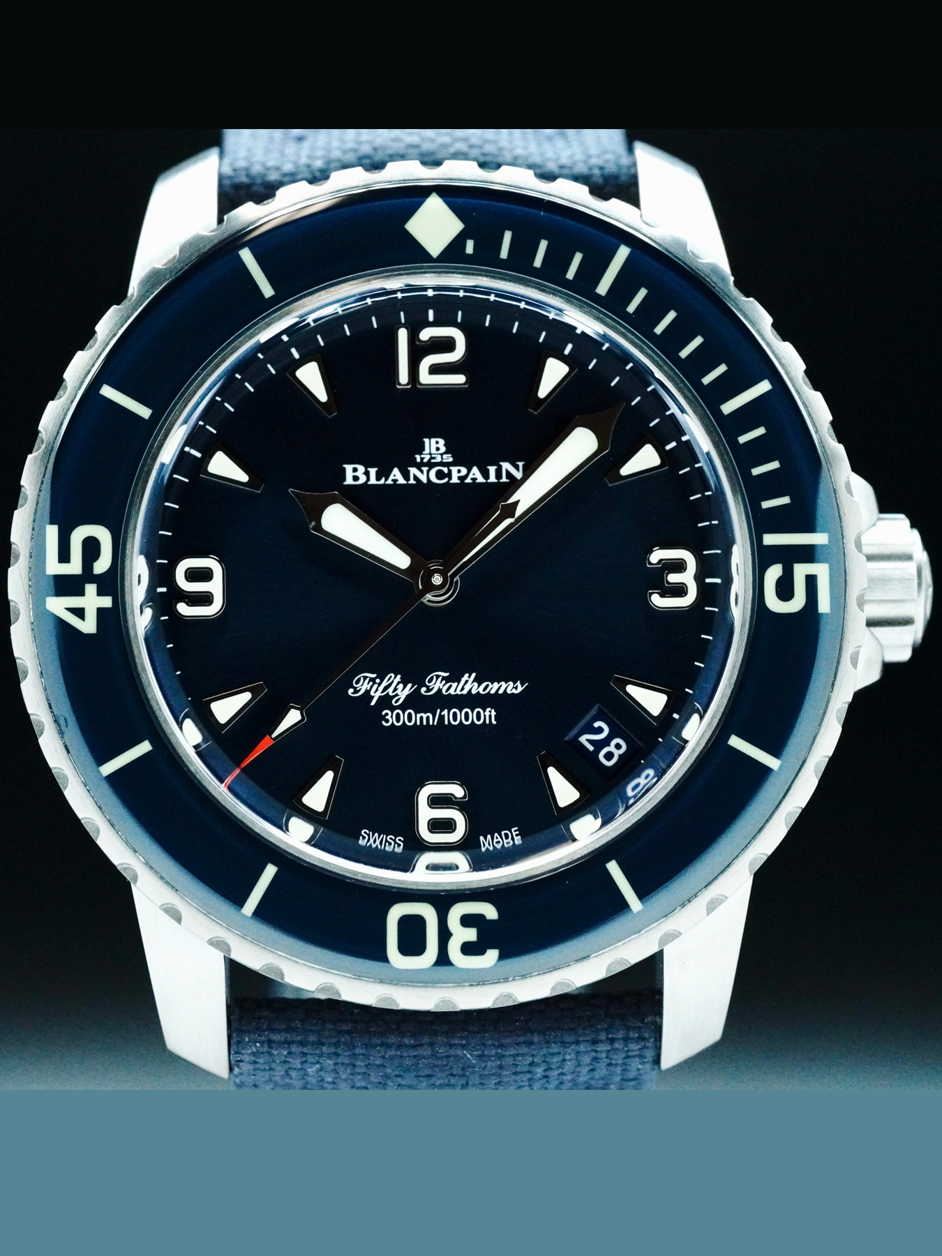 This watch features a 42.6mm titanium case on canvas strap. This watch also sports a blue dial. Powered by a mechanical automatic movement. Water resistance up to 300 meters.