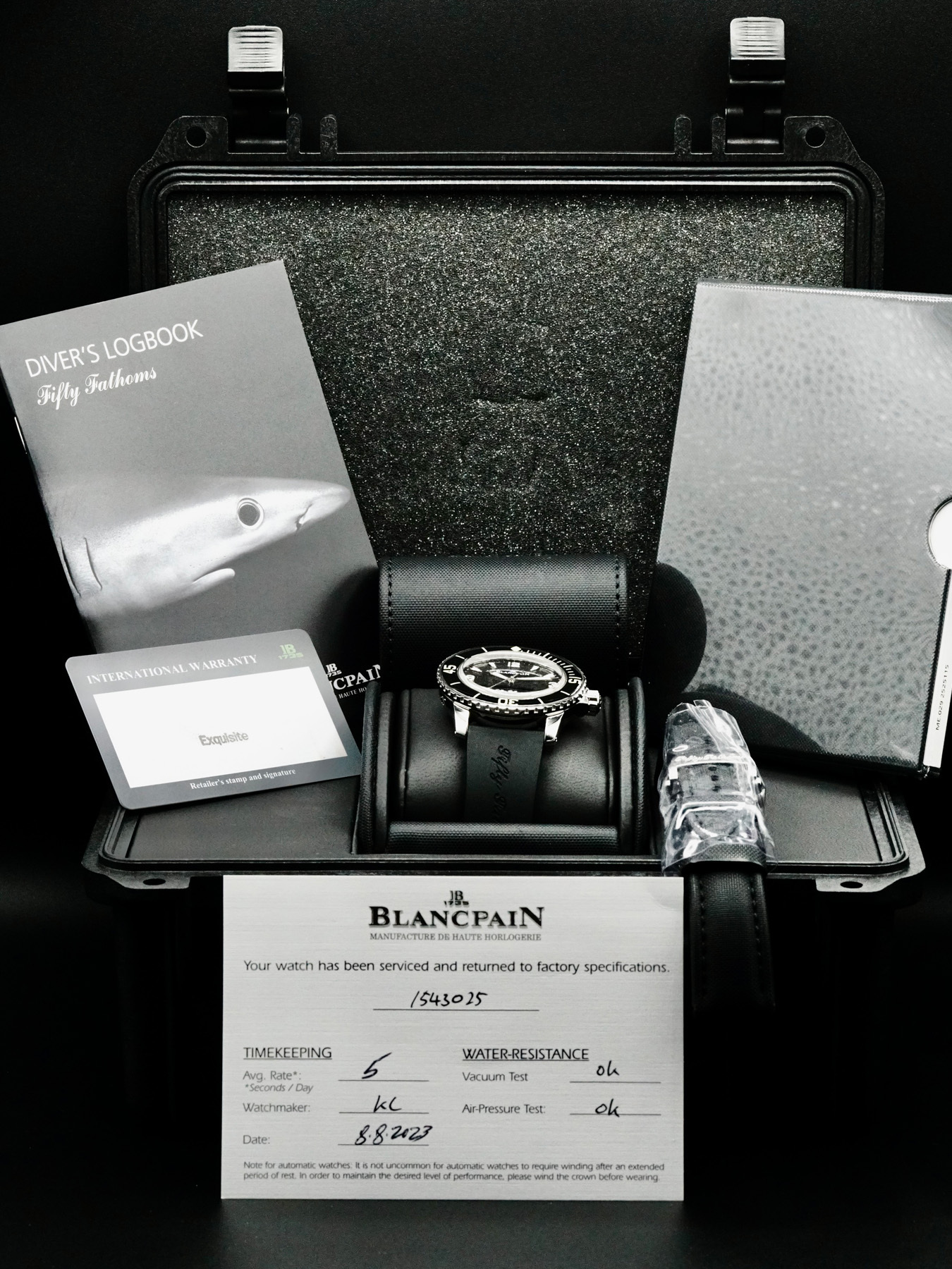 This Blancpain 5015-1130-52 Fifty Fathoms is in EXCELLENT condition. It has box, warranty no date, diver's logbook and technical booklet. Extra canvas strap.