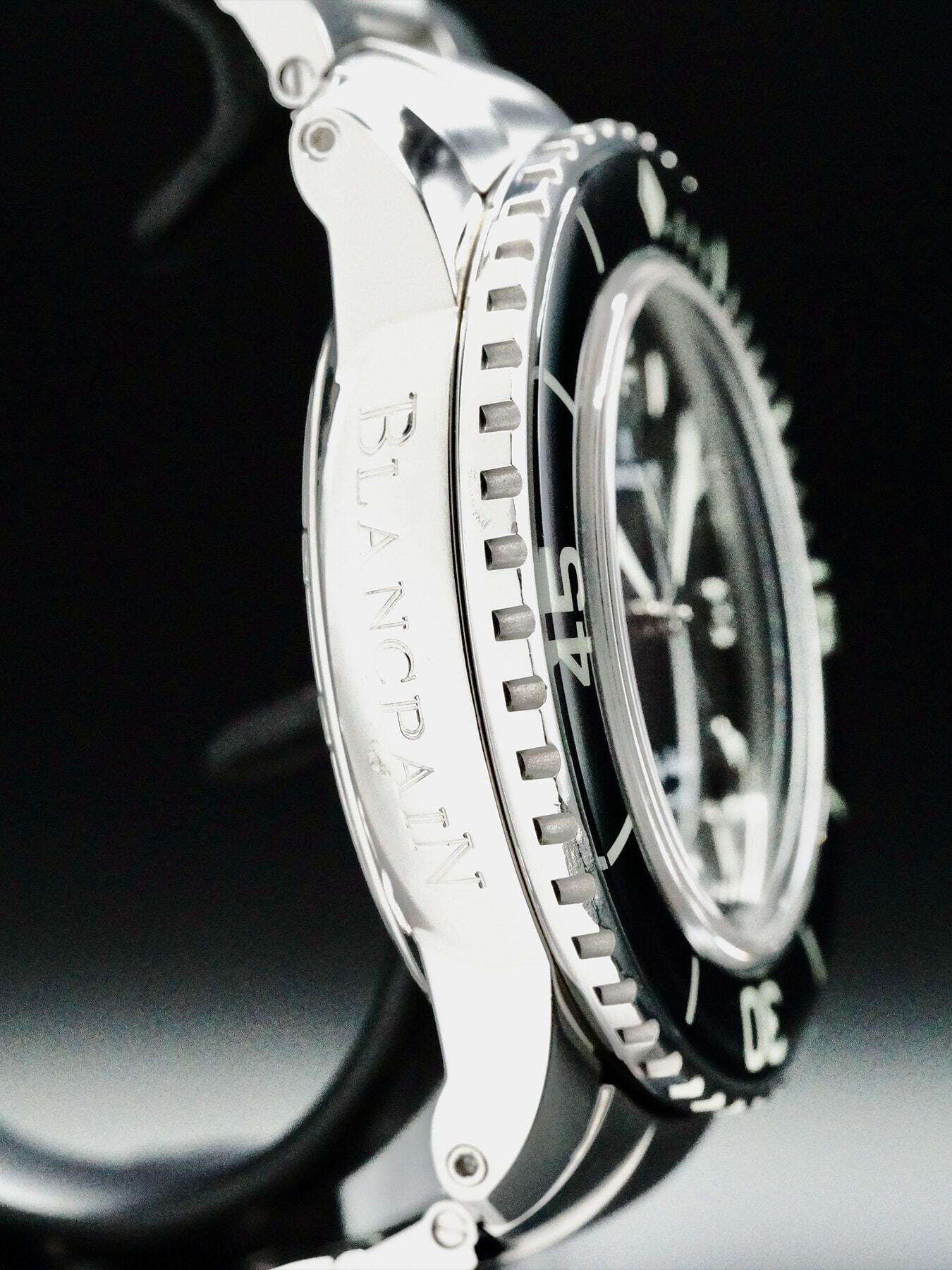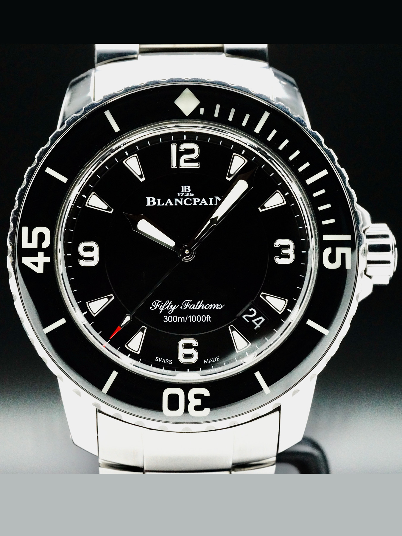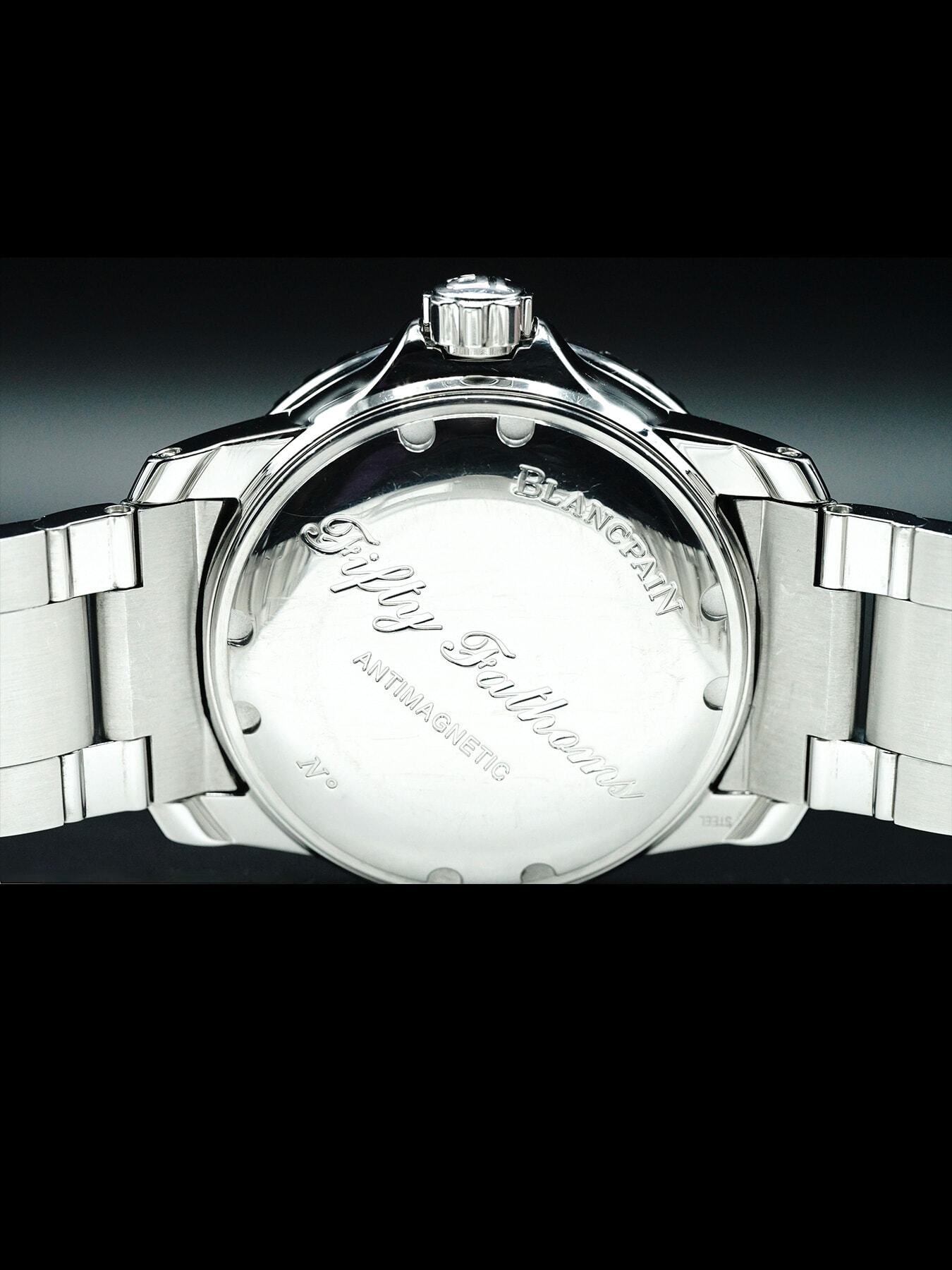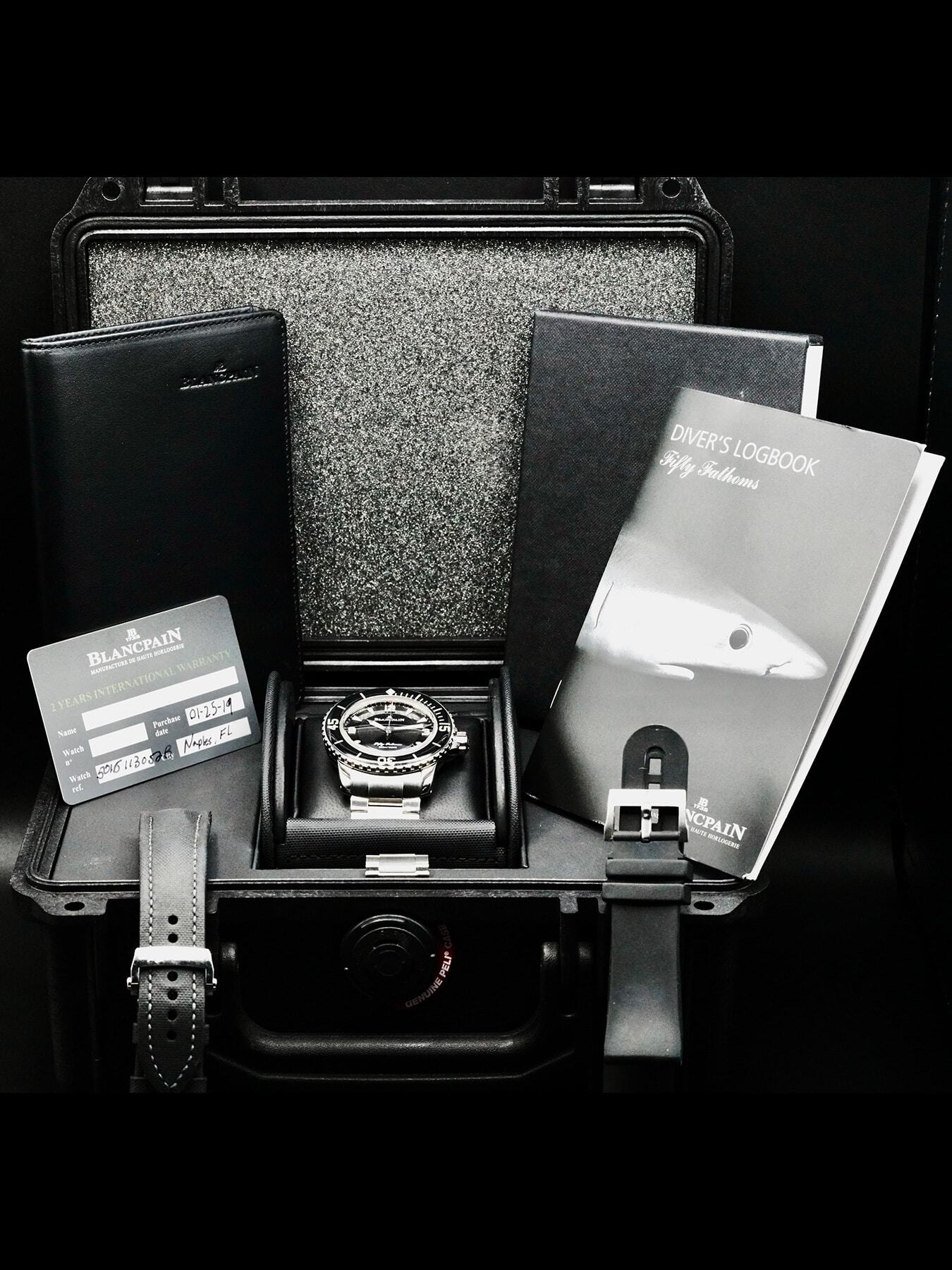 This Blancpain 5015 1130 52A Fifty Fathoms is in GREAT condition. This watch includes its Original Box, Original Papers and Warranty Dated 2019. Extra black sail canvas strap, black rubber strap, and stainless steel bracelet link. This watch has been fully authenticated and certified by Exquisite Timepieces.