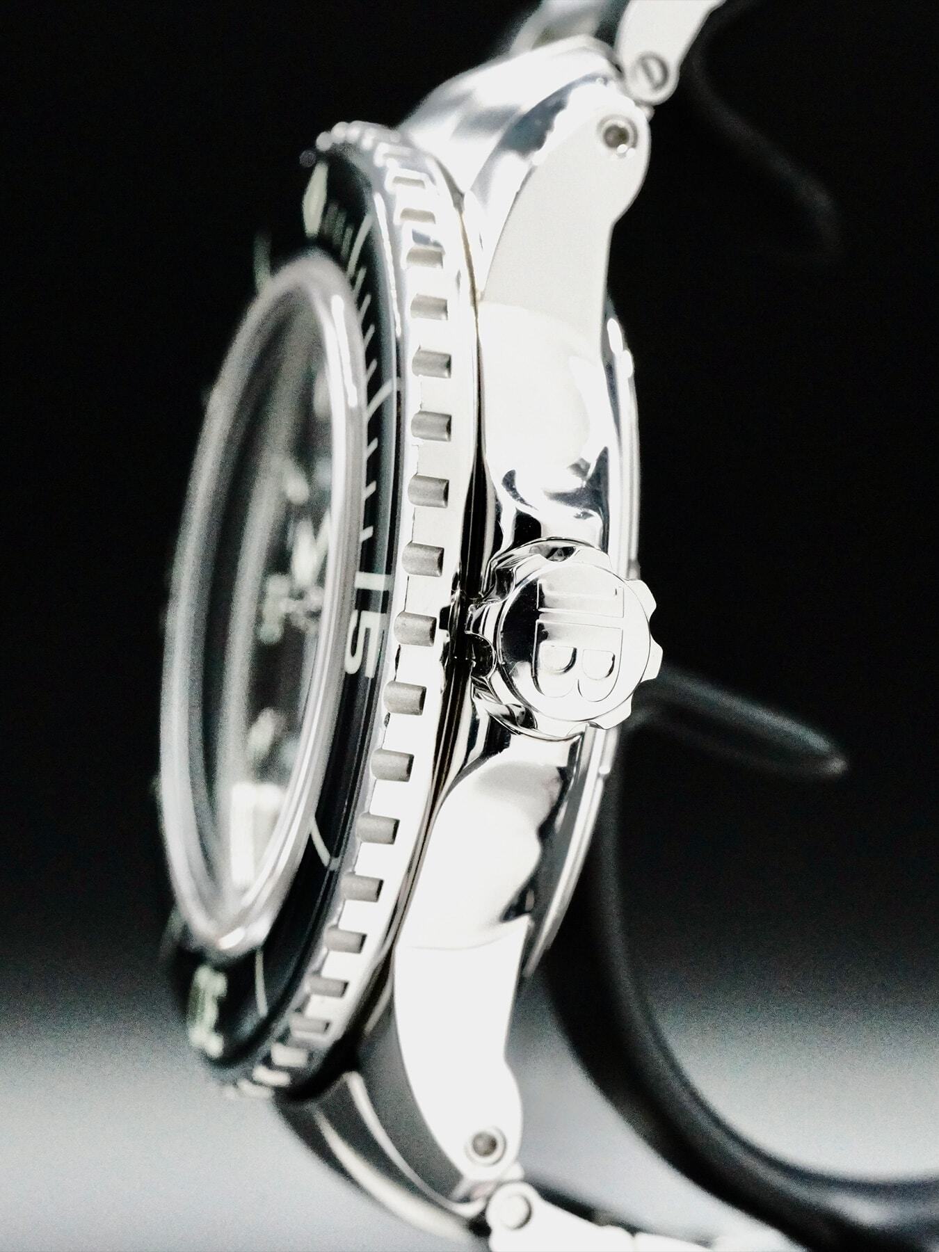 This watch features a 45 mm stainless steel case on sail canvas strap. This watch also sports a black dial. Powered by a mechanical automatic movement. Water resistance up to 300 meters.