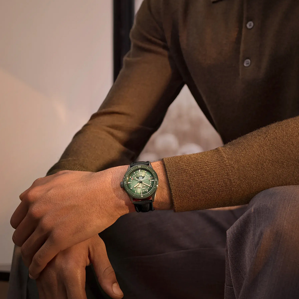 - This timepiece features a 43mm ceramic case paired with a high quality canvas strap. It showcases a distinctive green dial and is powered by a precise automatic winding movement. The watch is designed with a water resistance of up to 300m.
