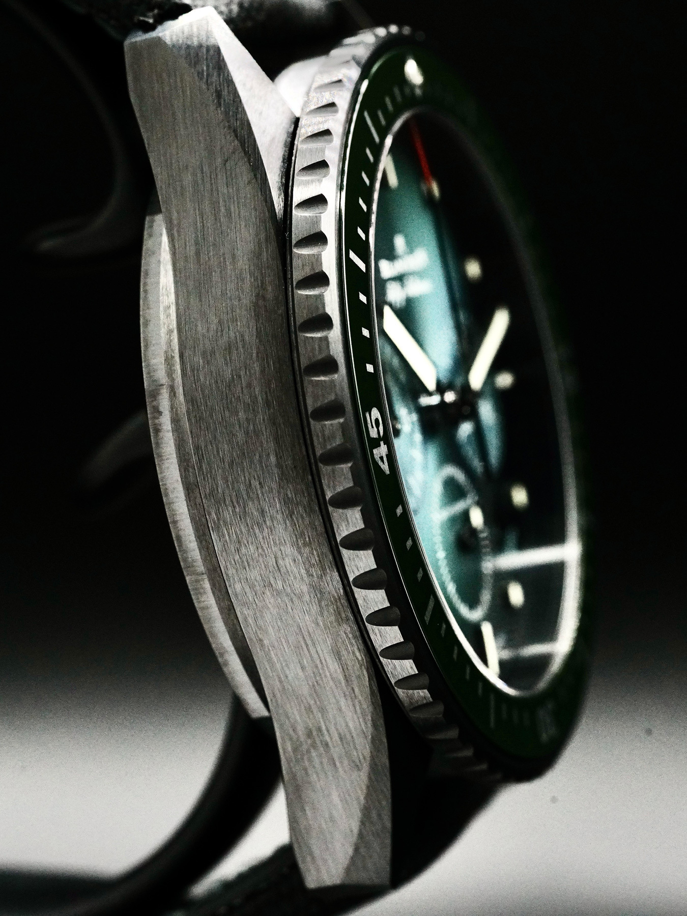 - This timepiece features a 43mm ceramic case paired with a high quality canvas strap. It showcases a distinctive green dial and is powered by a precise automatic winding movement. The watch is designed with a water resistance of up to 300m.