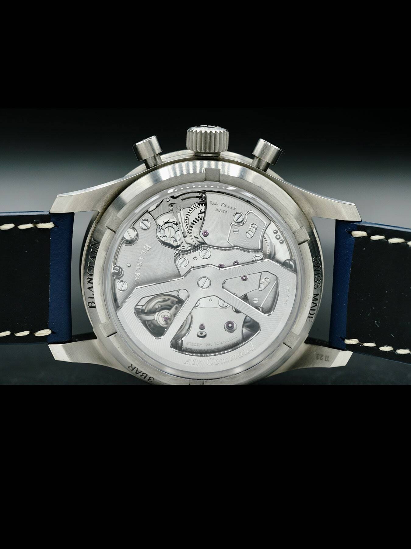 This Blancpain Air Command features a 42.5mm titanium case with a transparent case back on a blue leather strap. This watch also showcases a blue dial with luminous hands and dial markers covered by scratch resistant sapphire crystal.