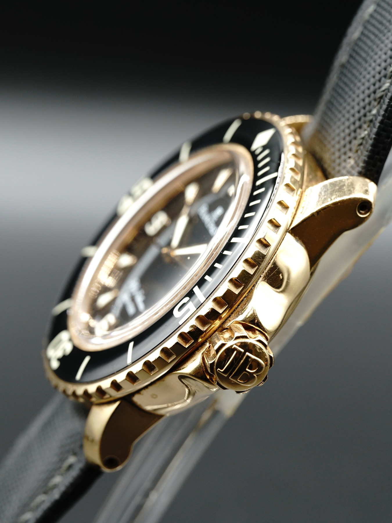 - This timepiece features a 45mm gold case paired with a high quality canvas strap. It showcases a distinctive black dial and is powered by a precise automatic winding movement. The watch is designed with a water resistance of up to 300m.