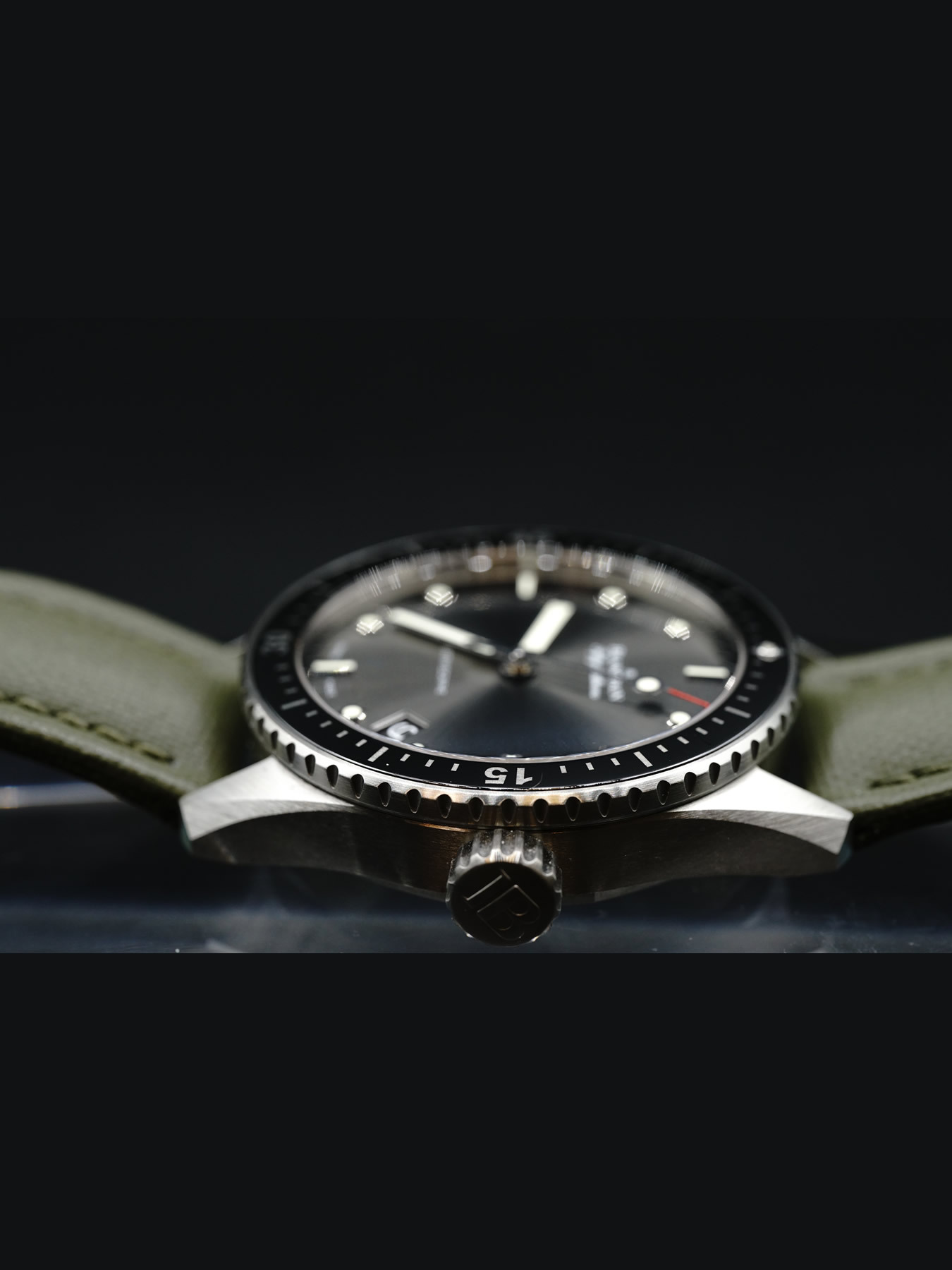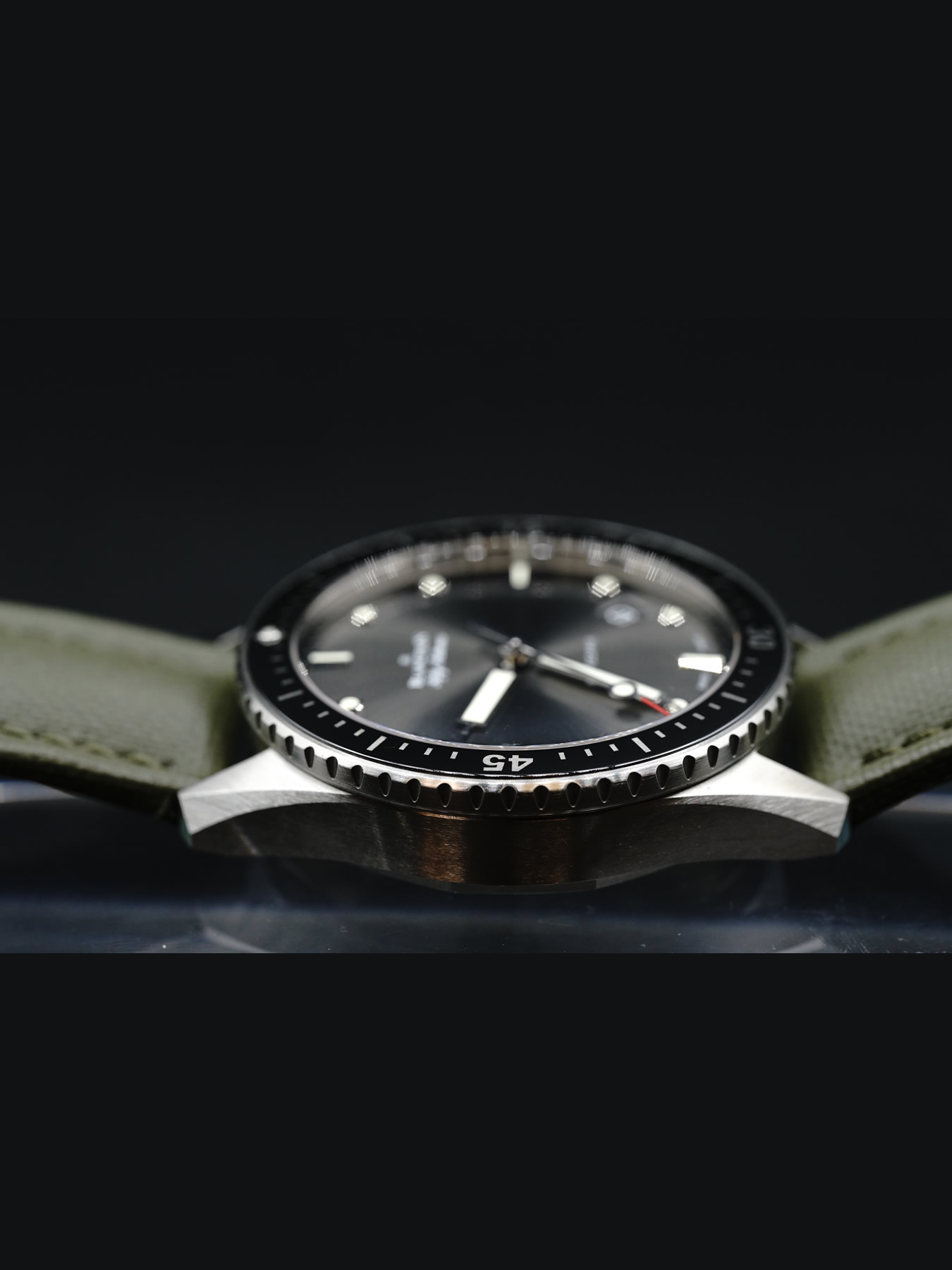 This Blancpain Fifty Fathoms Bathyscaphe features a 43mm stainless steel case with a transparent case back on a black sail-canvas fabric strap. This watch also showcases a "meteor" grey dial with luminous hands covered by scratch-resistant sapphire crystal.