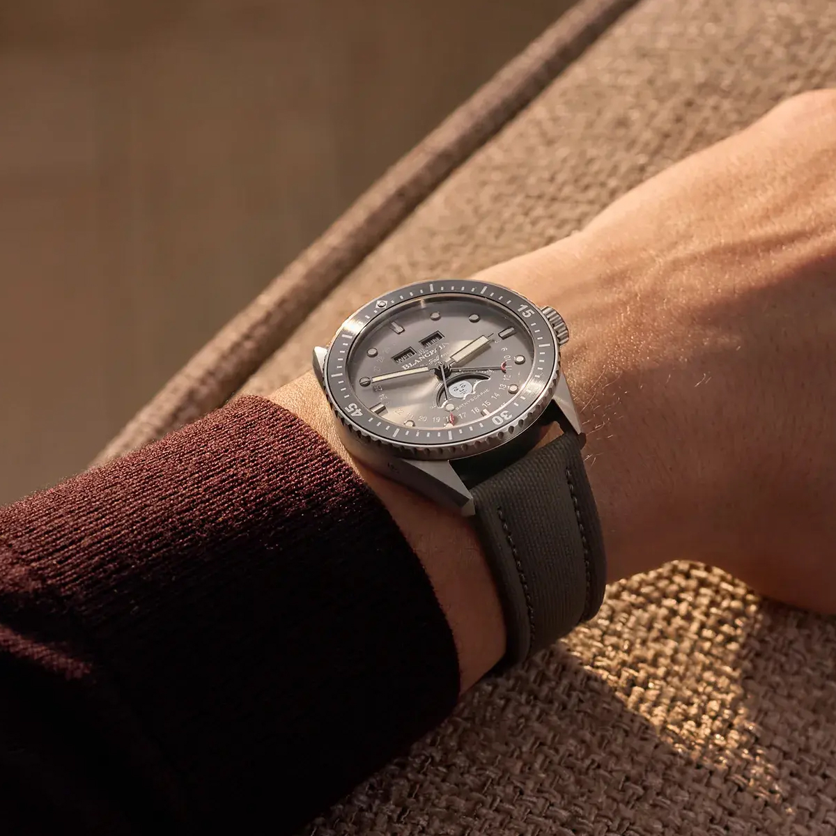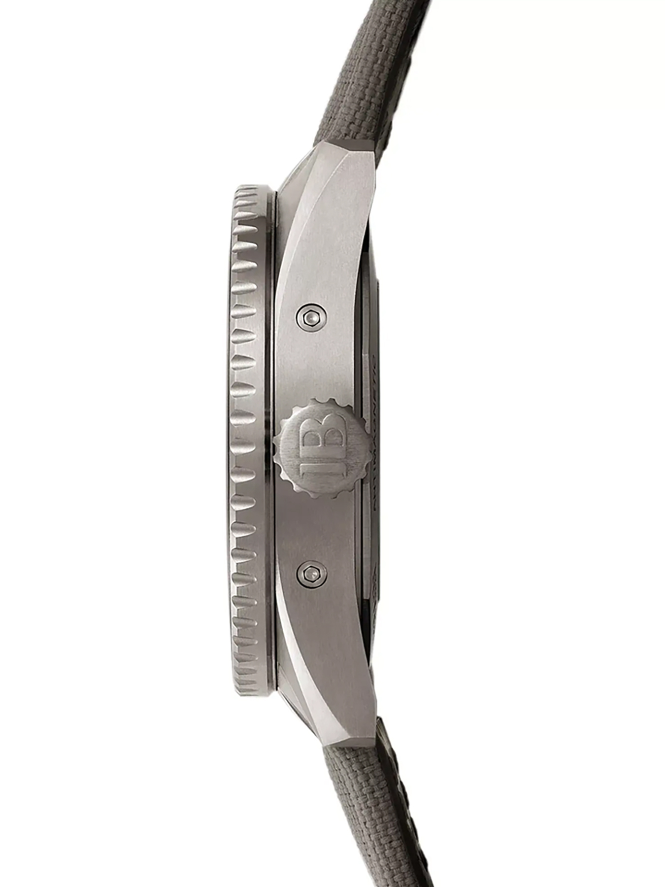 - This timepiece features a 43mm titanium case paired with a high quality canvas strap. It showcases a distinctive grey dial and is powered by a precise automatic winding movement. The watch is designed with a water resistance of up to 300m.