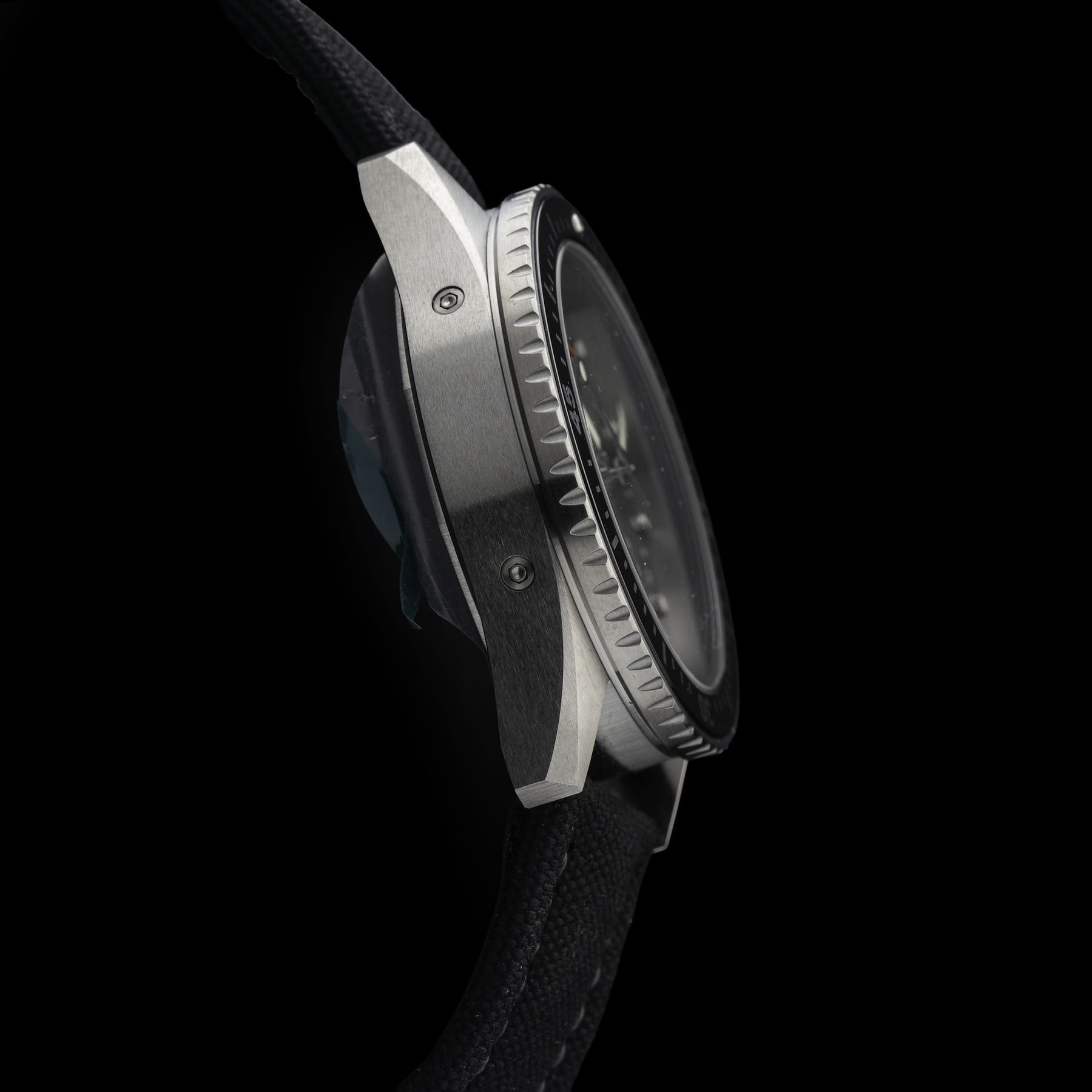 - This timepiece features a 43mm steel case paired with a high quality canvas strap. It showcases a distinctive grey dial and is powered by a precise automatic winding movement. The watch is designed with a water resistance of up to 300m.