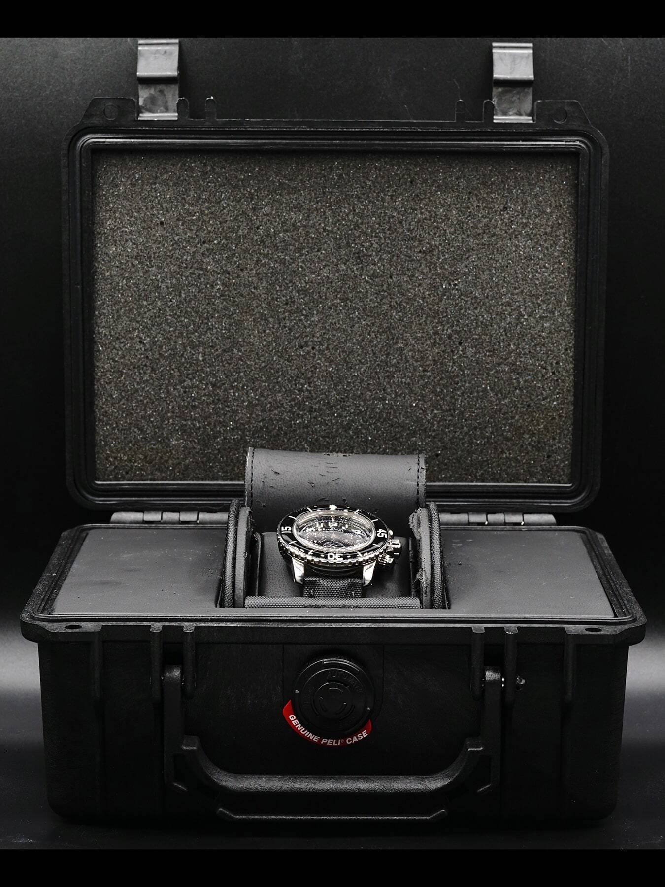 This Blancpain Fifty Fathoms Air Command Flyback features a 45mm stainless steel case with a bi-directional rotating bezel on a black fabric strap. This watch also showcases a metallic black dial with luminous index and hands covered by scratch resistant sapphire crystal.