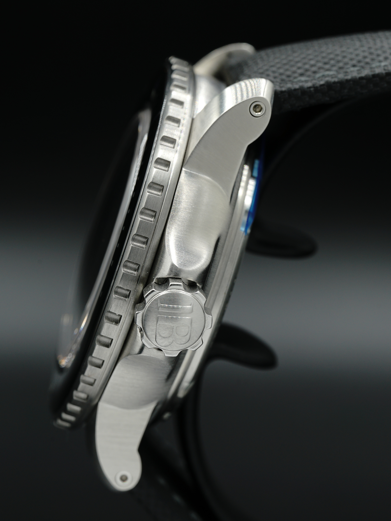 - This timepiece features a 45mm steel case paired with a high quality canvas strap. It showcases a distinctive black dial and is powered by a precise automatic winding movement. The watch is designed with a water resistance of up to 300m.