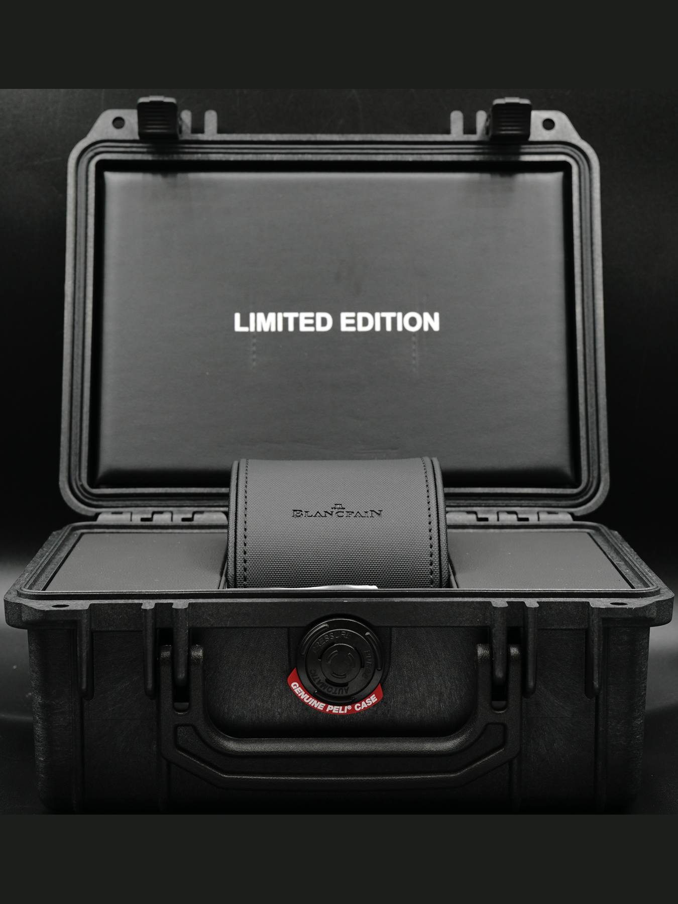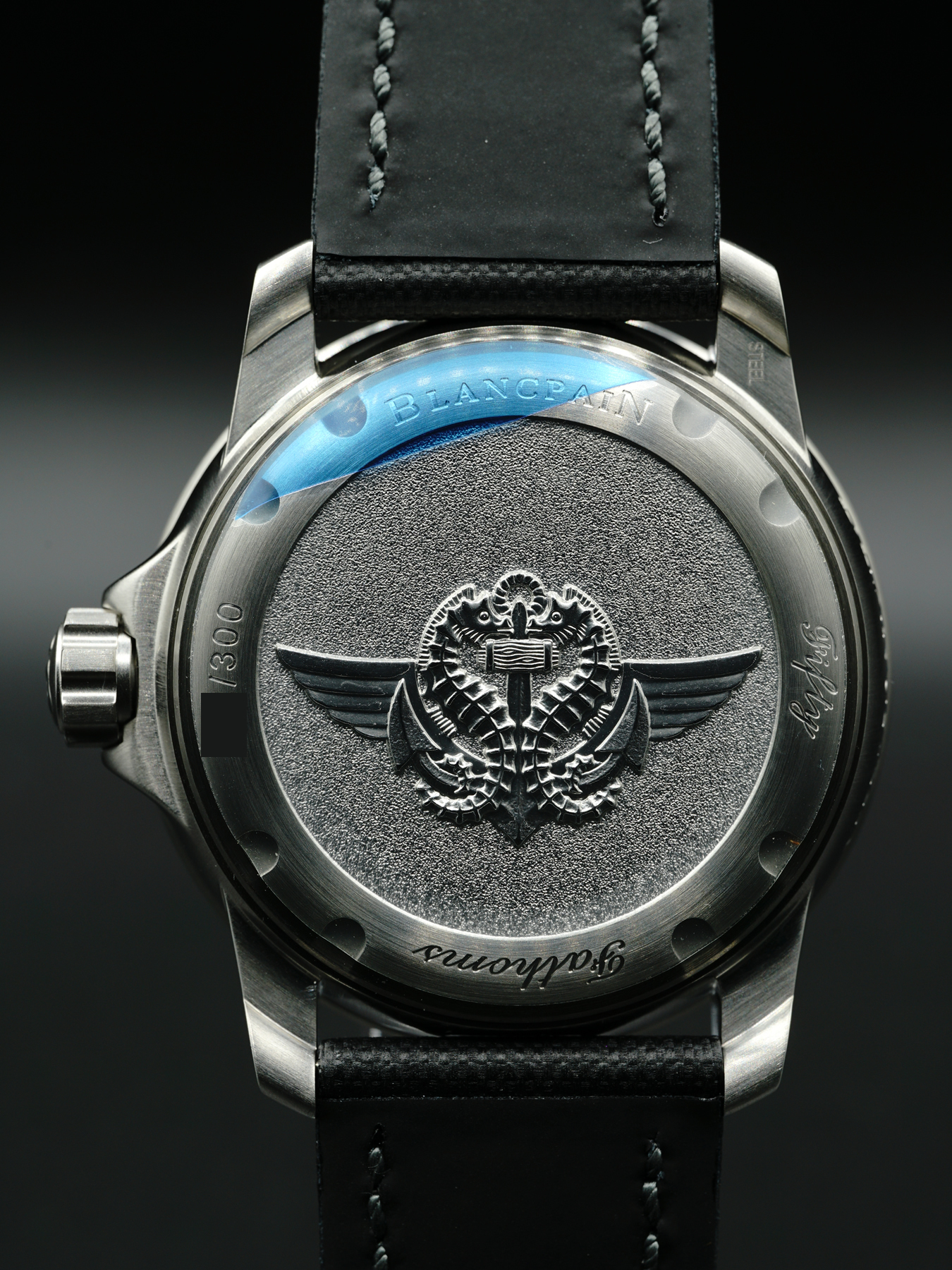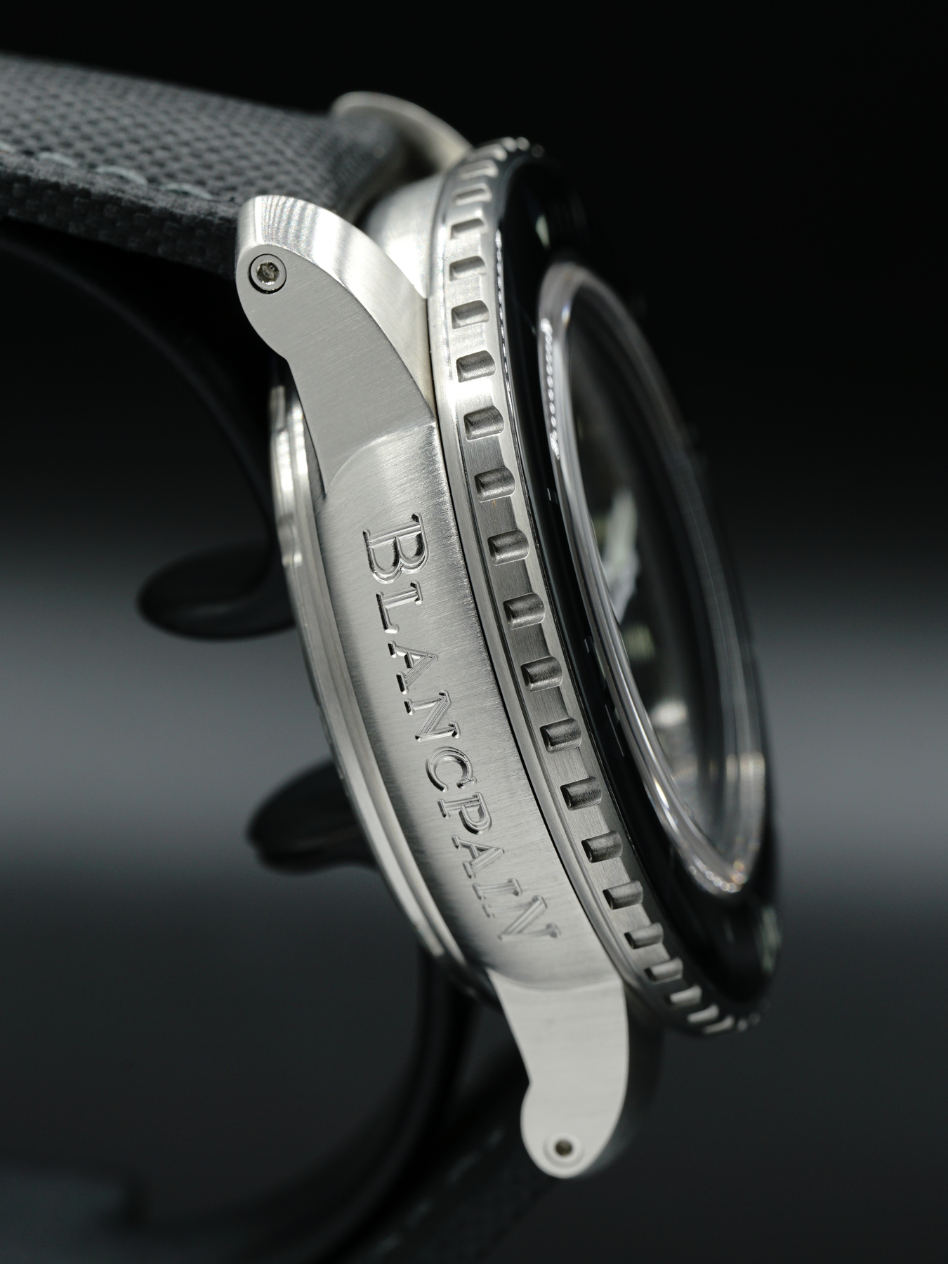 This Blancpain Fifty Fathoms Nageurs de combat Automatique is BRAND NEW, NEVER WORN, WITH FACTORY STICKERS. This is a limited edition watch; only 300 pieces made. This watch sports a silver-tone stainless steel case with a black sail-canvas strap. Unidirectional rotating coin edge stainless steel bezel with a black ceramic count-up elapsed time top ring. This specific watch includes its original box, papers, and warranty card.