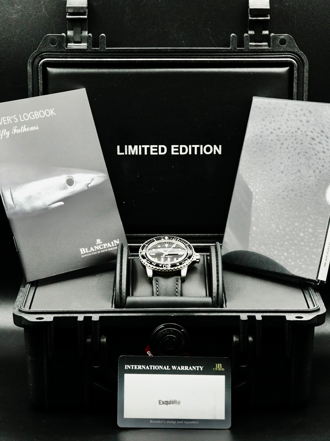 This Blancpain Fifty Fathoms Nageurs de Combat 5015E 1130 B52A is in EXCELLENT condition. This watch includes its original box, instruction manual, diver's logbook, and international warranty card dated for November 2021. Limited Edition of 300 pieces.